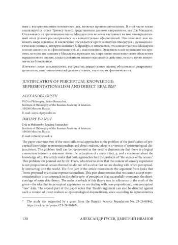 В работе исследуются два наиболее влиятельных подхода к проблеме обоснования перцептивного знания: репрезентационализм и прямой реализм, взятый в версии эпистемологического дизъюнктивизма. Саму проблему можно представить как необходимость продемонстрировать наличие логического перехода от утверждения о восприятии некоего факта, p, к утверждению о знании p. В статье отмечается, что оба подхода сталкиваются с проблемой «молчания чувств». На эту проблему указал Ч. Трэвис, который попытался показать, что содержание чувственного опыта не является пропозициональным, в этом смысле чувства сами по себе не говорят нам о том, с каким фактом мы имеем дело, перцептивно взаимодействуя с миром. В первой части статьи реконструируется аргумент от внешнего вида, предложенный Трэвисом для критики репрезентационализма. В этой части демонстрируется, что мы не можем принять репрезентационализм как подход в философии восприятия, успешно преодолевающий недостатки теории чувственных данных. Основным же недостатком данной теории являлась приверженность мифу о данном - представлению, согласно которому в опыте восприятия мы имеем дело с непропозициональными, концептуально неоформленными «сырыми» данными. Во второй части работы отмечается, что аргумент Трэвиса может быть также направлен против такой версии прямого реализма, как эпистемологический дизъюнктивизм, поскольку согласно представителям этого направления содержание достоверного перцептивного опыта, будучи тождественным с воспринимаемым положением дел, является пропозициональным. В этой части также анализируется ответ Трэвису такого представителя данного направления, как Дж. Макдауэл. Отказываясь от пропозиционализма, Макдауэл тем не менее настаивает на том, что перцептивный опыт должен рассматриваться как концептуально оформленный. Это позволяет нам избежать мифа о данном. В заключение обсуждается критика подхода Макдауэла с феноменологической позиции, которую занимает Х. Дрейфус, и отмечается, что концептуализм Макдауэла вполне совместим и с феноменологией, и с энактивизмом. Энактивистское понимание восприятия, которое мы находим у Макдауэла, приводит нас к принятию энактивистского объяснения перцептивного знания, когда основанием знания оказывается действие, то есть нечто эпистемически безосновное.
