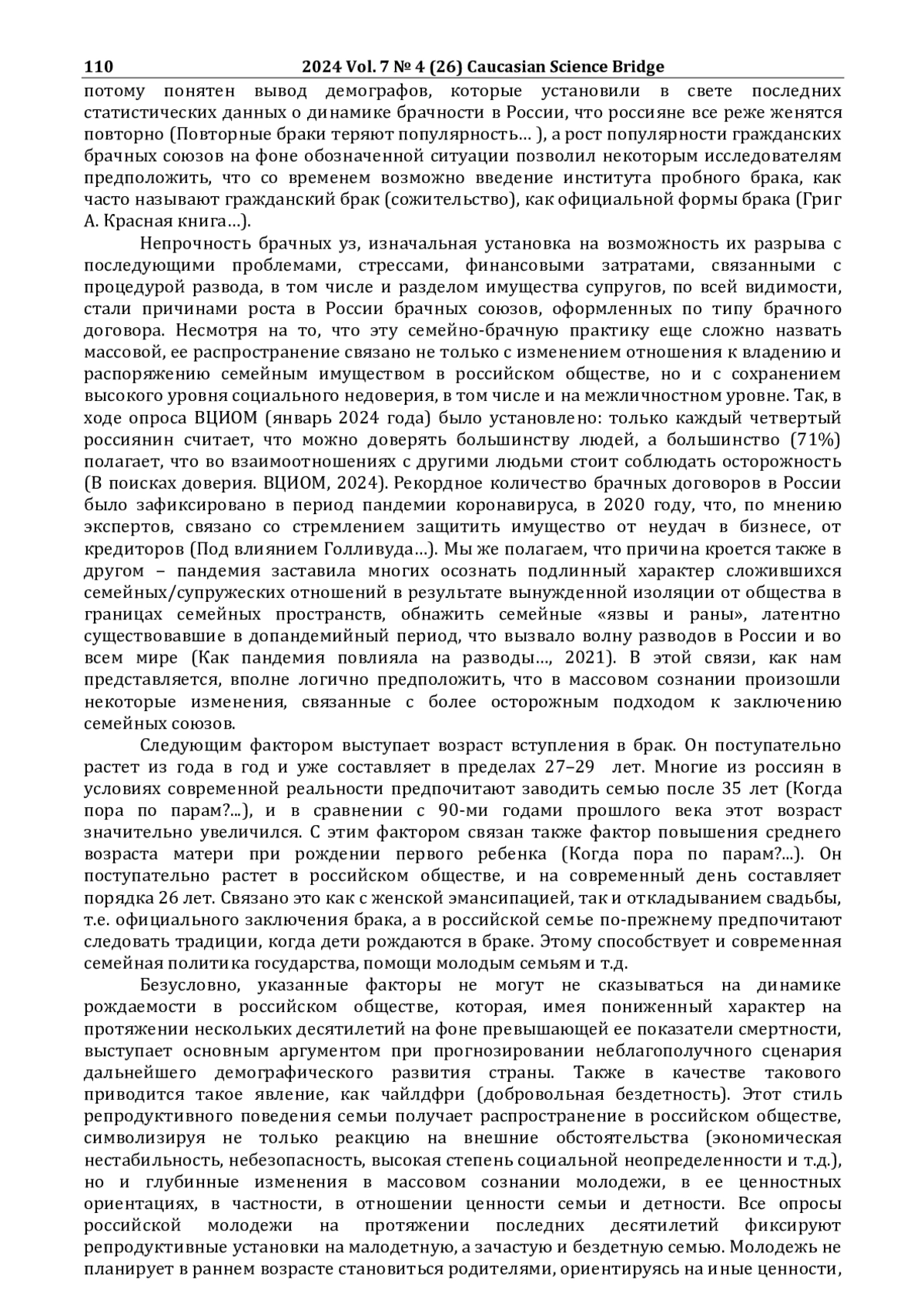 Современные дискуссии вокруг настоящего и будущего российской семьи все чаще и чаще принимают характер катастрофических прогнозов (Катастрофа института семьи…, 2024). Специалисты в области социологии семьи пророчат гибель этому ключевому социальному институту, ответственному за воспроизводство общества посредством реализации функций по рождению и воспитанию детей. Продолжение рода, воспитание детей, любовь и другие составляющие института семьи, как полагают исследователи, в недалеком будущем окажутся на свалке истории. Так ли это? Стоит ли так категорично говорить о кризисах и катастрофах, угрожающих семье? Возможно, это не тот язык, которым следует описывать происходящее с семьей изменения с учетом того, что семья по-прежнему остается важнейшей ценностью в системе ценностей российского общества? Очевидно, что речь идет о трансформации института семьи, о чем говорят многочисленные факторы, и приведем важнейшие из них, обычно используемые для анализа демографического состояния российского общества, столь же критически оцениваемого (Росстат оценил динамику …, 2023), как и состояние института семьи.