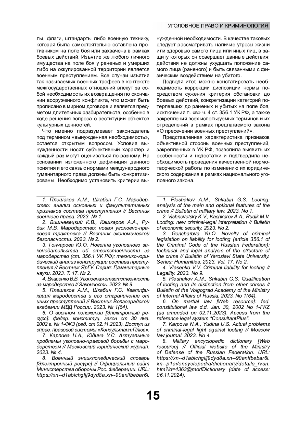 1. Плешаков А.М., Шкабин Г.С. Мародерство: анализ основных и факультативных признаков состава преступления // Вестник военного права. 2023. № 1. EDN: TXFMUO