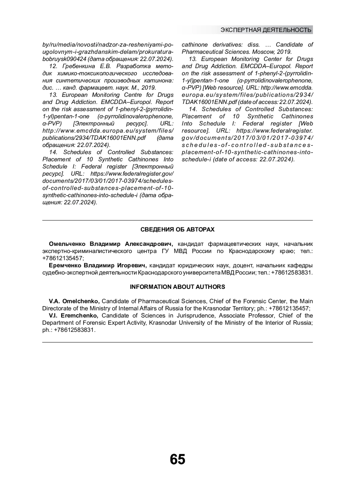 1. Протасов К.В., Арутюнов А.С. Оценка корректности механизма отнесения α-пирролидиновалерофенона (α-PVP) к наркотическому средству (по материалам ЭКЦ ГУ МВД России по Краснодарскому краю) // Вестник Краснодарского университета МВД России. 2019. № 2(44). EDN: ZVUGXS