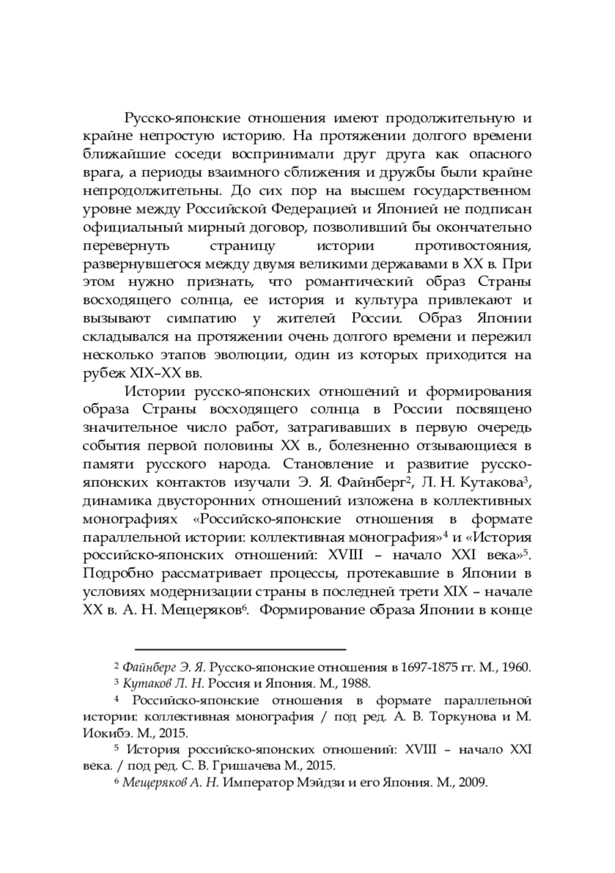 Русско-японские отношения имеют продолжительную и крайне непростую историю. На протяжении долгого времени ближайшие соседи воспринимали друг друга как опасного врага, а периоды взаимного сближения и дружбы были крайне непродолжительны. До сих пор на высшем государственном уровне между Российской Федерацией и Японией не подписан официальный мирный договор, позволивший бы окончательно перевернуть страницу истории противостояния, развернувшегося между двумя великими державами в XX в. При этом нужно признать, что романтический образ Страны восходящего солнца, ее история и культура привлекают и вызывают симпатию у жителей России. Образ Японии складывался на протяжении очень долгого времени и пережил несколько этапов эволюции, один из которых приходится на рубеж XIX–XX вв.