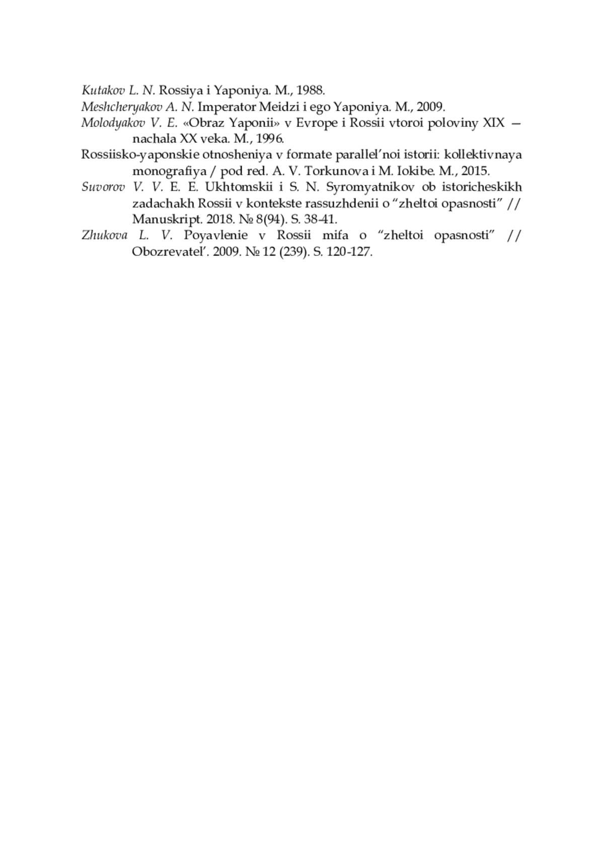 22. Суворов В. В. Э. Э. Ухтомский и С. Н. Сыромятников об исторических задачах России в контексте рассуждений о “желтой опасности” // Манускрипт. 2018. № 8(94) C. 38-41.