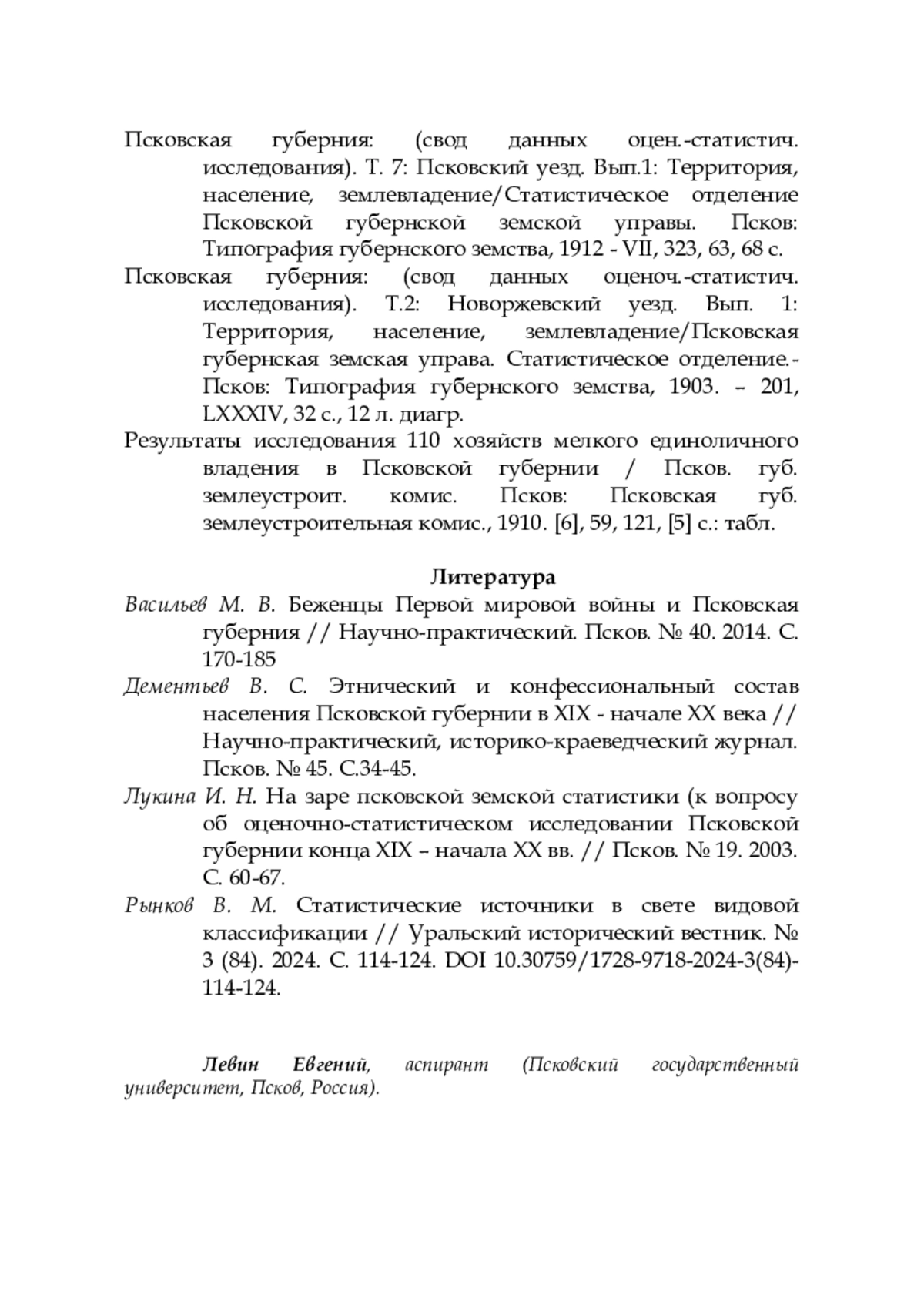 3. Лукина И. Н. На заре псковской земской статистики (к вопросу об оценочно-статистическом исследовании Псковской губернии конца XIX - начала XX вв. // Псков. № 19. 2003. С. 60-67.