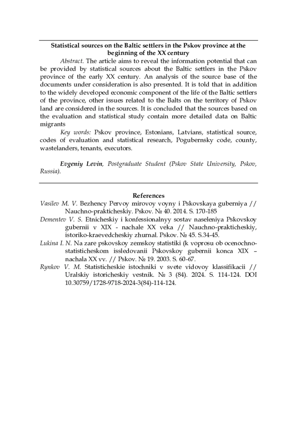 4. Рынков В. М. Статистические источники в свете видовой классификации // Уральский исторический вестник. № 3 (84). 2024. С. 114-124. DOI: 10.30759/1728-9718-2024-3(84)-114-124 EDN: CWKOPC
