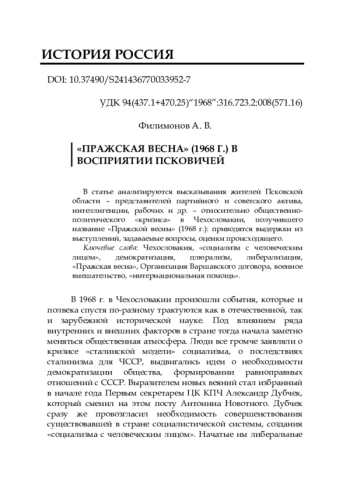 В статье анализируются высказывания жителей Псковской области - представителей партийного и советского актива, интеллигенции, рабочих и др. - относительно общественно-политического «кризиса» в Чехословакии, получившего название «Пражской весны» (1968 г.): приводятся выдержки из выступлений, задаваемые вопросы, оценки происходящего.
