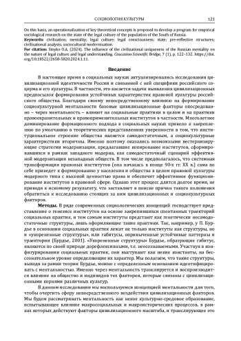 Результаты и их обсуждение. В статье показано, что влияние цивилизационной дистанцированности России и Запада на правовую культуру россиян происходит через действие исторически сформировавшихся социокультурных характеристик, в частности специфики восприятия государства как сакрализованной инстанции. Осуществлен цивилизационный анализ общности и различия правовой культуры в российском и западном социумах. На этом основании предложена операционализация ключевых теоретических понятий для разработки программы эмпирического социологического исследования состояния правовой культуры населения Юга России.