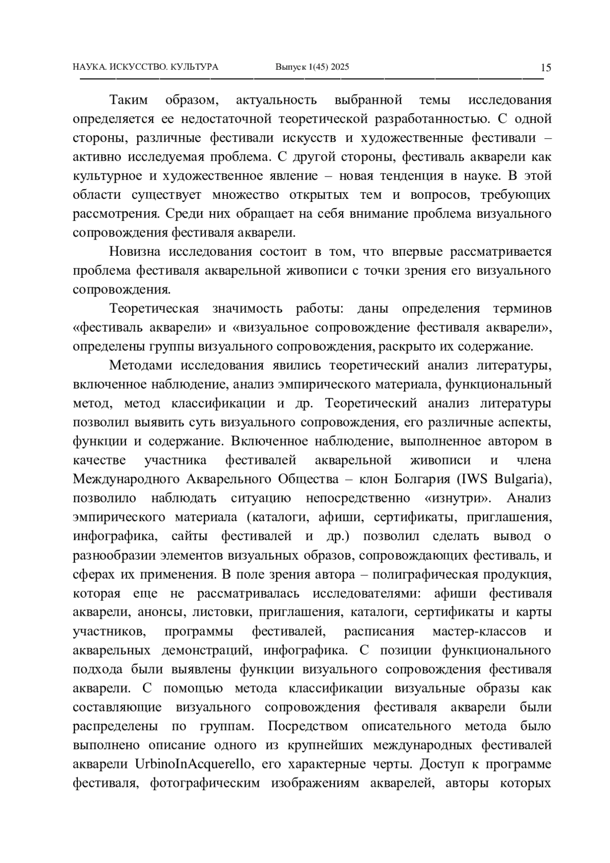 В XXI в. в значительной степени возрастает интерес к самой древней технике живописи – искусству акварели как в международном, так и региональном масштабе. Развитие художественной индустрии и распространение фестивалей акварели во всем мире обусловили возрождение, осмысление и поиски новых путей развития искусства акварельной живописи, рассматриваемой ее во всем жанровом и тематическом многообразии. Несмотря на быстрое распространение акварельных фестивалей, они до настоящего момента не становились предметом исследования в гуманитарной области знания. Наибольшее внимание авторов уделяется другим видам фестивалей в области искусства – театральным, музыкальным, хореографическим и др.
