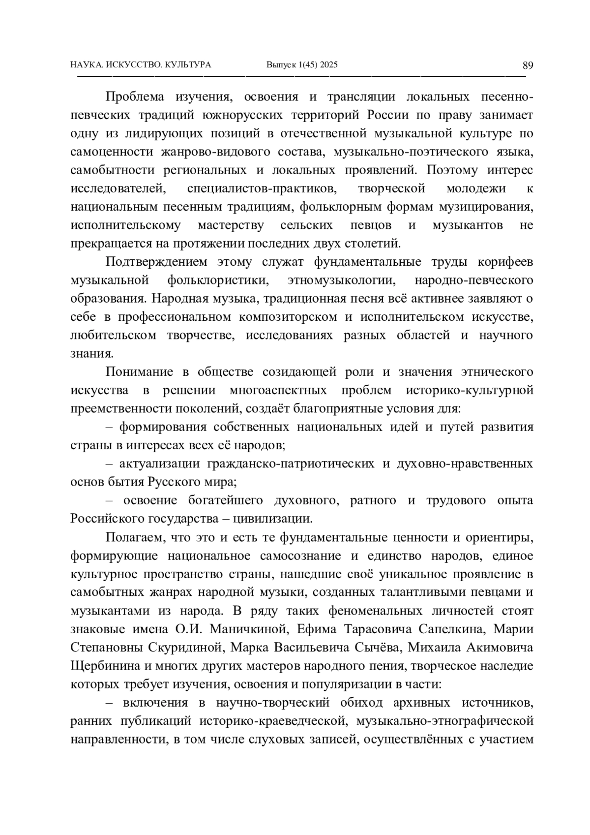 Проблема изучения, освоения и трансляции локальных песеннопевческих традиций южнорусских территорий России по праву занимает одну из лидирующих позиций в отечественной музыкальной культуре по самоценности жанрово-видового состава, музыкально-поэтического языка, самобытности региональных и локальных проявлений. Поэтому интерес исследователей, специалистов-практиков, творческой молодежи к национальным песенным традициям, фольклорным формам музицирования, исполнительскому мастерству сельских певцов и музыкантов не прекращается на протяжении последних двух столетий.