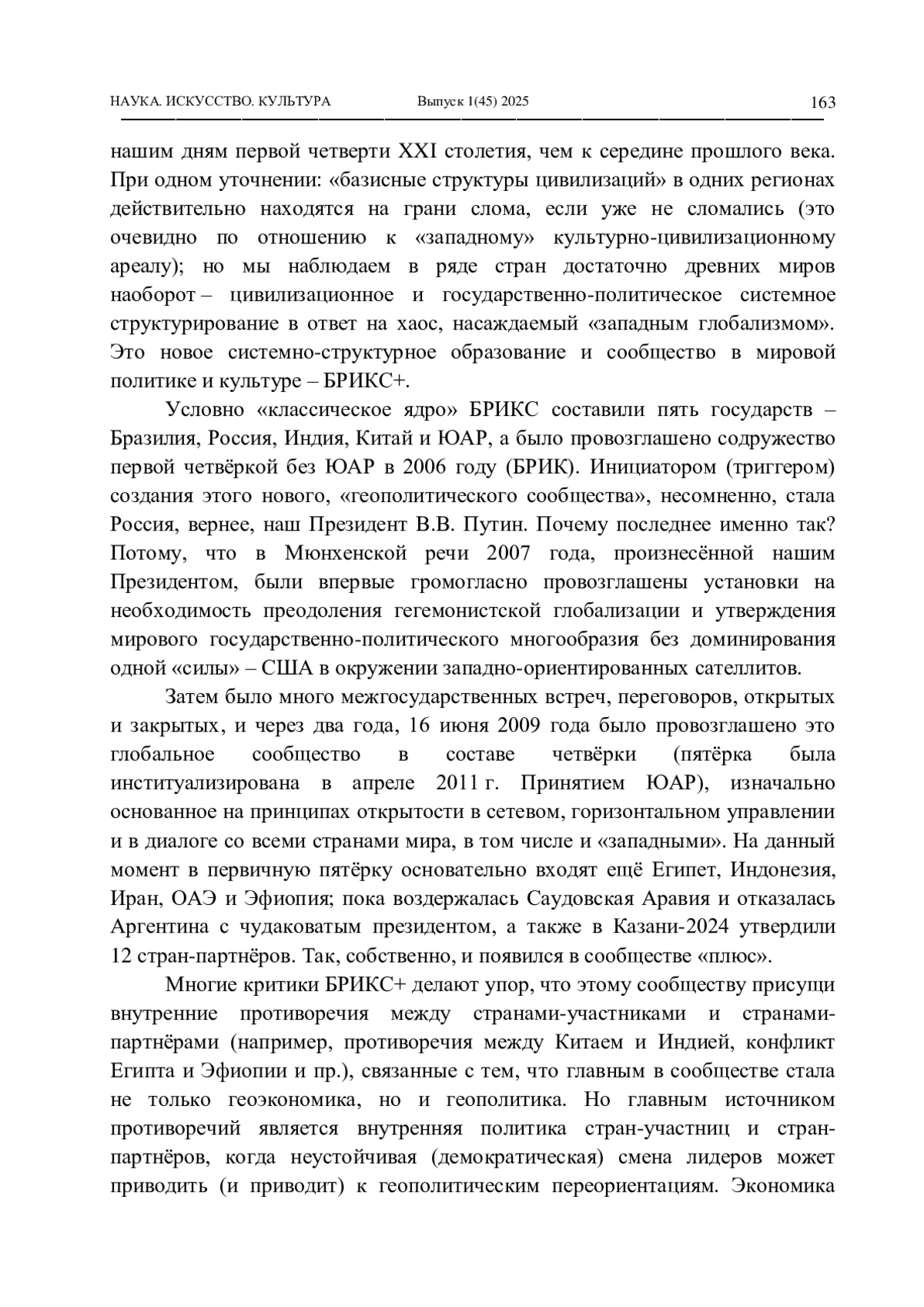В статье представлена авторская аналитика культурно-цивилизационного и государственно-политического плюрализма стран-участниц БРИКС+, связанная с многообразием этнополитических и пространственно-временных характеристик как внутри этих государств, так и в глобальном взаимодействии.