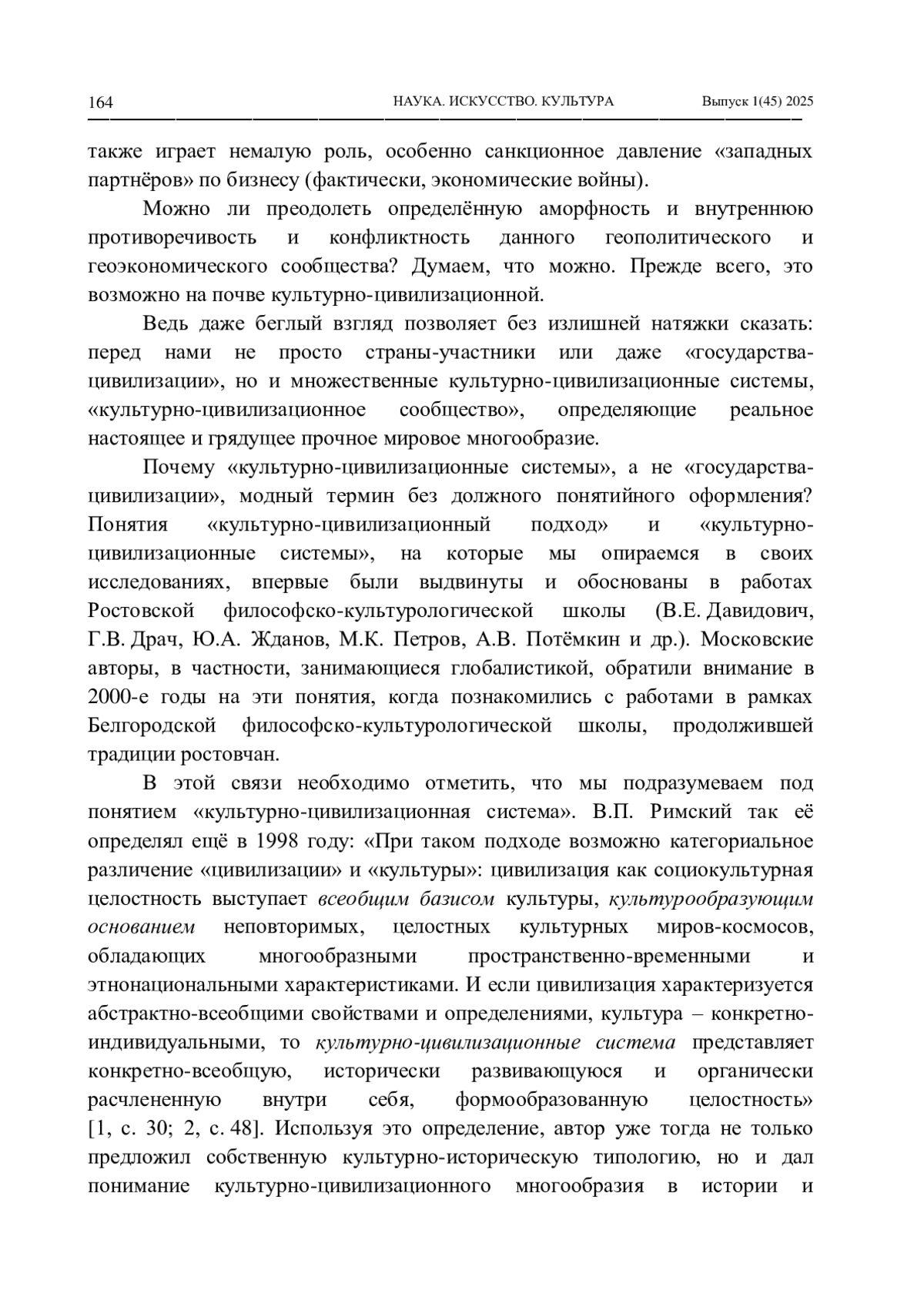 6. Римский, В. П. Культурно-цивилизационная специфика России: модели понимания и прогнозы / В. П. Римский, О. Н. Римская // Вестник МГУКИ. - 2019. - № 3 (89). - С. 10-22.