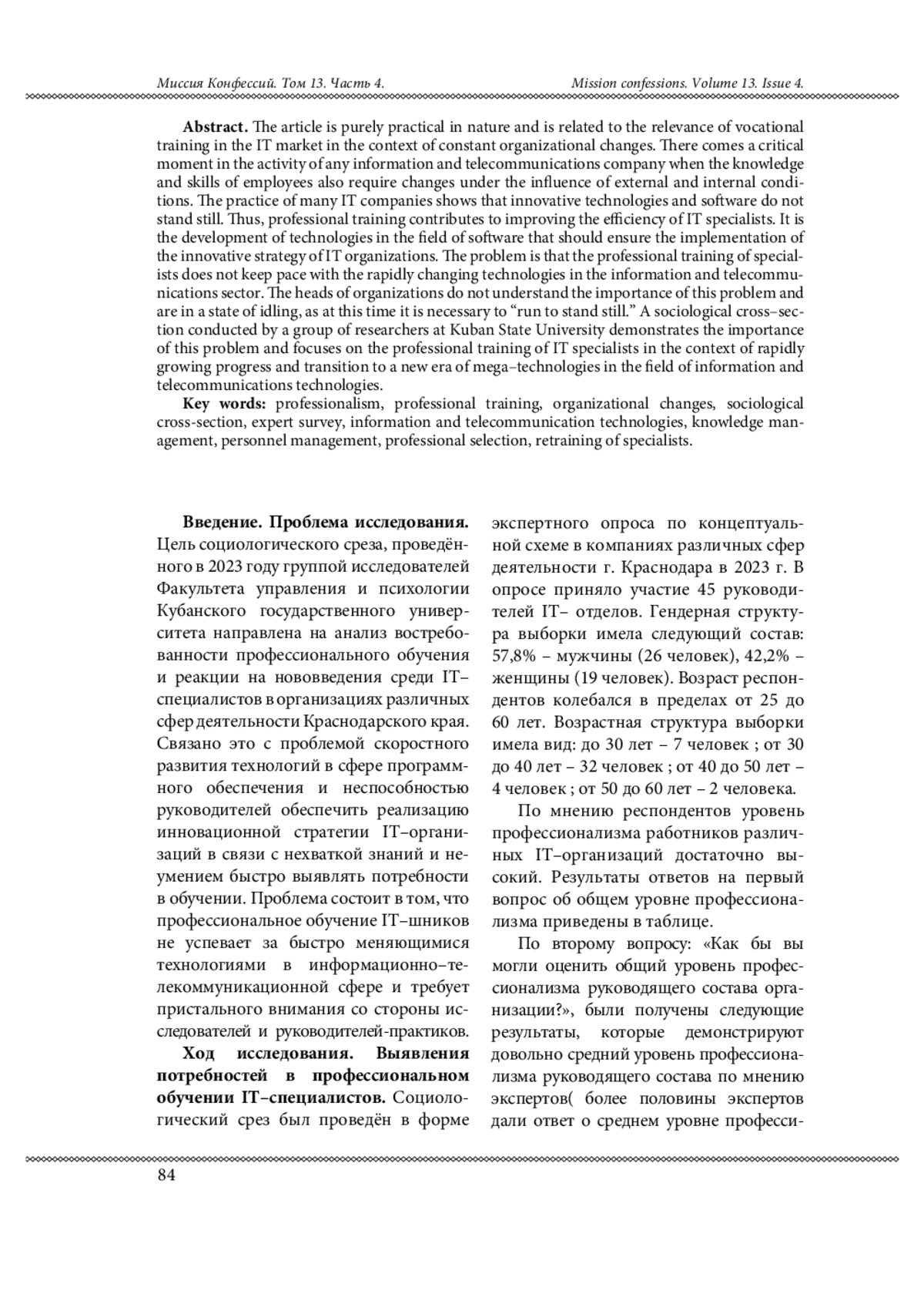 Цель социологического среза, проведённого в 2023 году группой исследователей факультета управления и психологии Кубанского государственного университета направлена на анализ востребованности профессионального обучения и реакции на нововведения среди IT– специалистов в организациях различных сфер деятельности Краснодарского края.