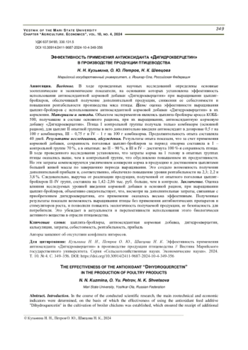 9. Кузьмина Н. Н., Петров О. Ю. Влияние биологически активного вещества “Дигидрокверцетин” в рационах цыплят-бройлеров кросса КОББ-500 на их рост и мясную продуктивность // Вестник Марийского государственного университета. Серия “Сельскохозяйственные науки. Экономические науки”. 2020. № 1 (21). С. 24-32. DOI: 10.30914/2411-9687-2020-6-1-24-31 EDN: DFBQKS