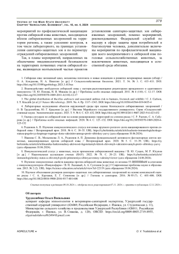 4. Лабораторные исследования объектов окружающей среды при оценке безопасности сибиреязвенных захоронений / О. В. Трудолюбова, Ю. Г. Крысенко [и др.] // Вестник Марийского государственного университета. Серия “Сельскохозяйственные науки. Экономические науки”. 2023. Т. 9. № 4. С. 423-432. DOI: 10.30914/2411-9687-2023-9-4-423-432 EDN: EBWFTR