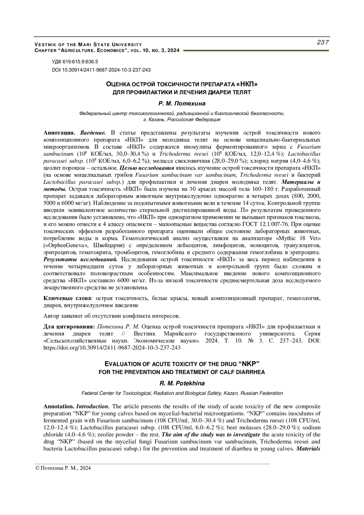 13. Исследование острой токсичности искусственного сухого молозива / П. В. Быкова, Р. Р. Мусин [и др.] // Современные проблемы экспериментальной и клинической токсикологии, фармакологии и экологии: сб. тезисов докладов Международной научно-практической конференции (г. Казань, 09-10 сентября 2021 г.). Казань: Федеральный центр токсикологической, радиационной и биологической безопасности, 2021. С. 93-95. URL: item.as p?id=48025766 (дата обращения 04.04.2024). EDN: BQLEVA