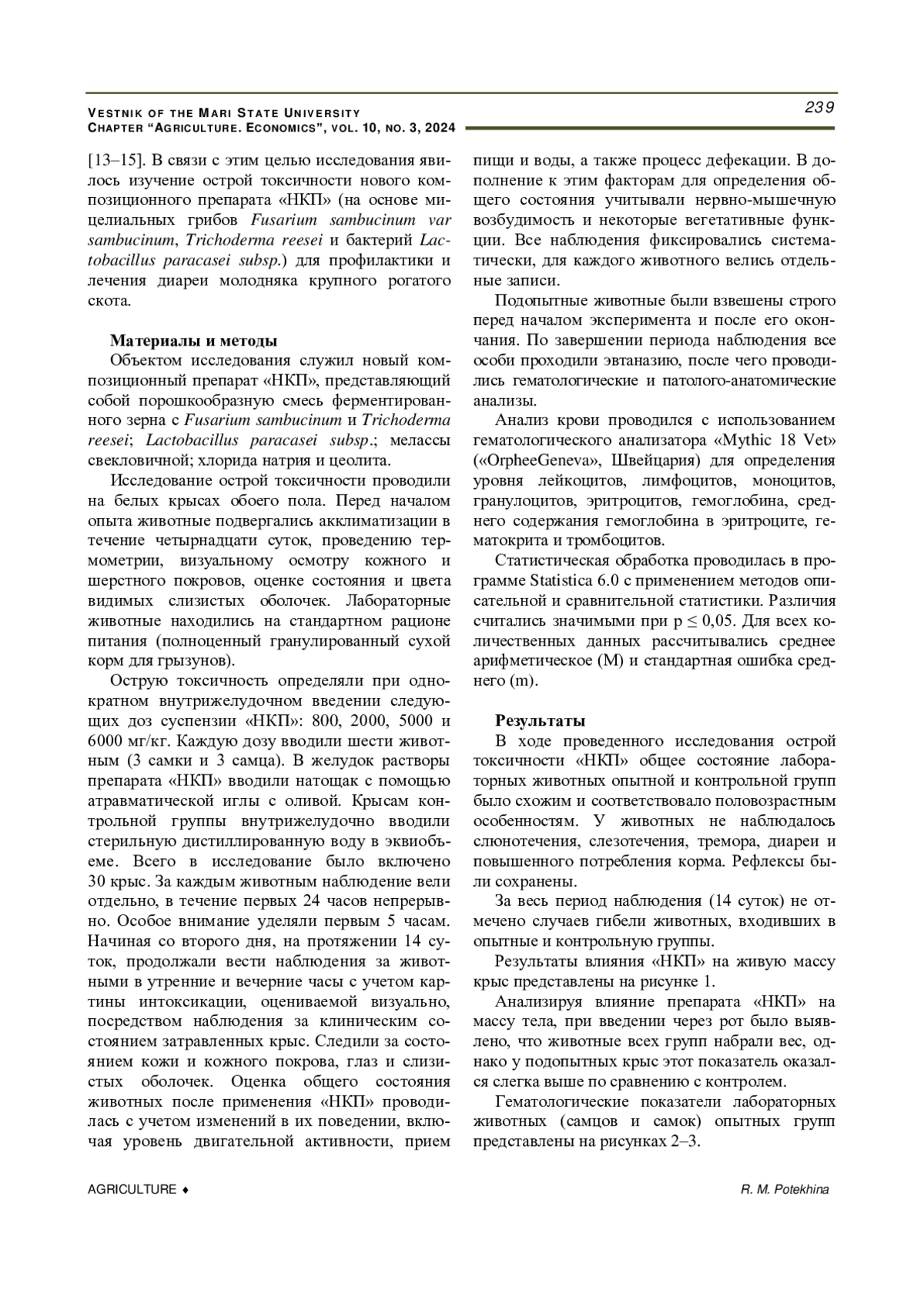 Материалы и методы. Острая токсичность «НКП» была изучена на 30 крысах массой тела 160-180 г. Разработанный препарат задавался лабораторным животным внутрижелудочно однократно в четырех дозах (800, 2000, 5000 и 6000 мг/кг). Наблюдение за подопытными животными вели в течение 14 суток. Контрольной группе вводили эквивалентное количество стерильной дистиллированной воды. По результатам проведенного исследования было установлено, что «НКП» при однократном применении не вызывает признаков токсикоза, и его можно отнести к 4 классу опасности - малоопасные вещества согласно ГОСТ 12.1.007-76. При оценке токсических эффектов разработанного препарата оценивали общее состояние лабораторных животных, потребление воды и корма. Гематологический анализ осуществляли на анализаторе «Mythic 18 Vet» («OrpheeGeneva», Швейцария) с определением лейкоцитов, лимфоцитов, моноцитов, гранулоцитов, эритроцитов, гематокрита, тромбоцитов, гемоглобина и среднего содержания гемоглобина в эритроците. Результаты исследований. Исследования острой токсичности «НКП» за весь период наблюдения в течение четырнадцати суток у лабораторных животных и контрольной групп было схожим и соответствовало половозрастным особенностям. Максимальное введение нового композиционного средства «НКП» составило 6000 мг/кг. Из-за низкой токсичности среднесмертельная доза исследуемого лекарственного средства не установлена.