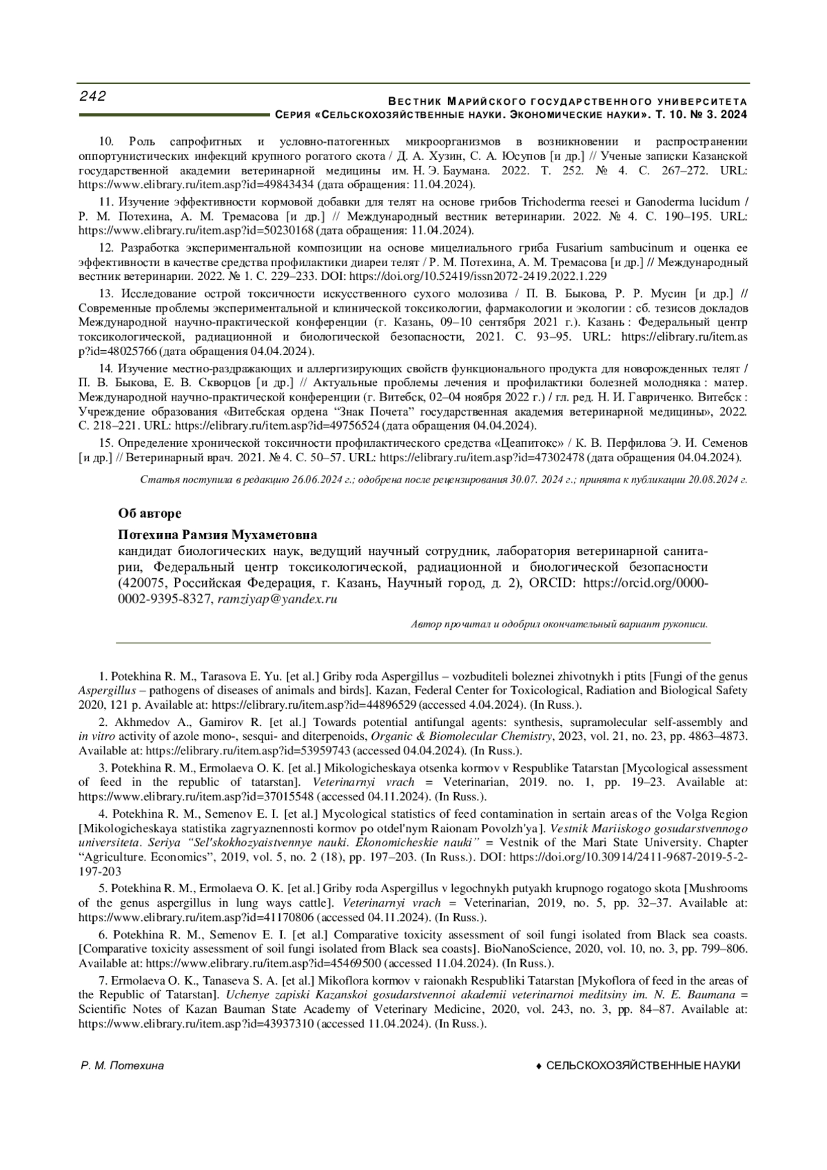 3. Микологическая оценка кормов в Республике Татарстан / Р. М. Потехина, О. К. Ермолаева [и др.] // Ветеринарный врач. 2019. № 1. С. 19-23. URL: item.asp?id=37015548 (дата обращения: 11.04.2024). EDN: YYAFVJ