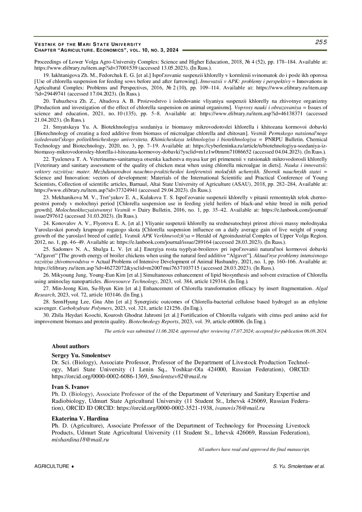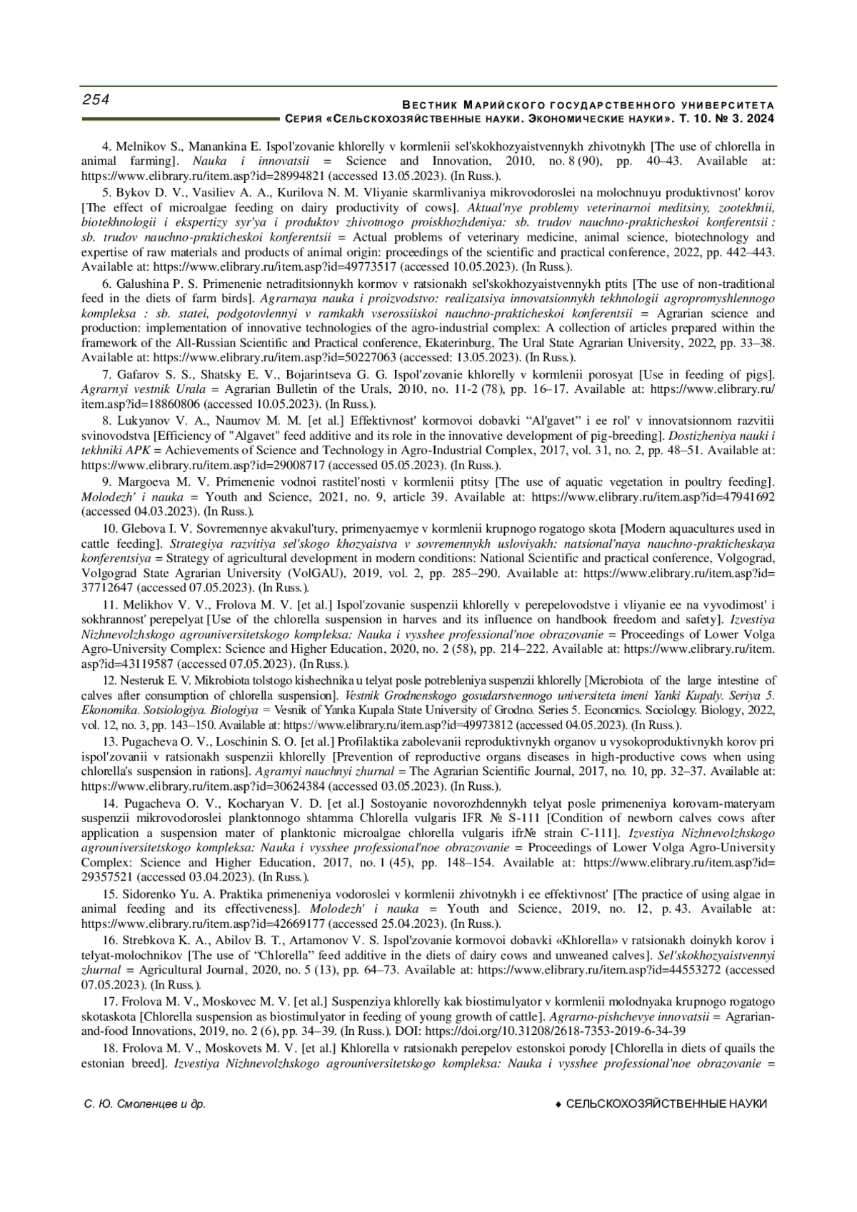 16. Стребкова К. А., Абилов Б. Т., Артамонов В. С. Использование кормовой добавки “Хлорелла” в рационах дойных коров и телят-молочников // Сельскохозяйственный журнал. 2020. № 5 (13). С. 64-73. URL: item.asp?id=44553272 (дата обращения: 07.05.2023). EDN: ATNVNG
