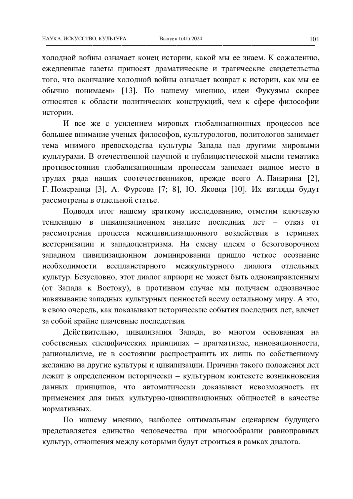 Задача данной статьи, предлагаемой вниманию читателя, является критическое рассмотрение эволюционистской теории культуры Карла Ясперса, включающей в себя понятие «осевого времени» и выдвигающей на первые роли западную культуру. Ясперс видится нам как, с одной стороны, поборник единства человечества, но с другой – как предтеча глобализма, автор вполне западноцентристский, что, в свою очередь, перекликается с печально известной концепцией Фрэнсиса Фукуямы о «конце истории».