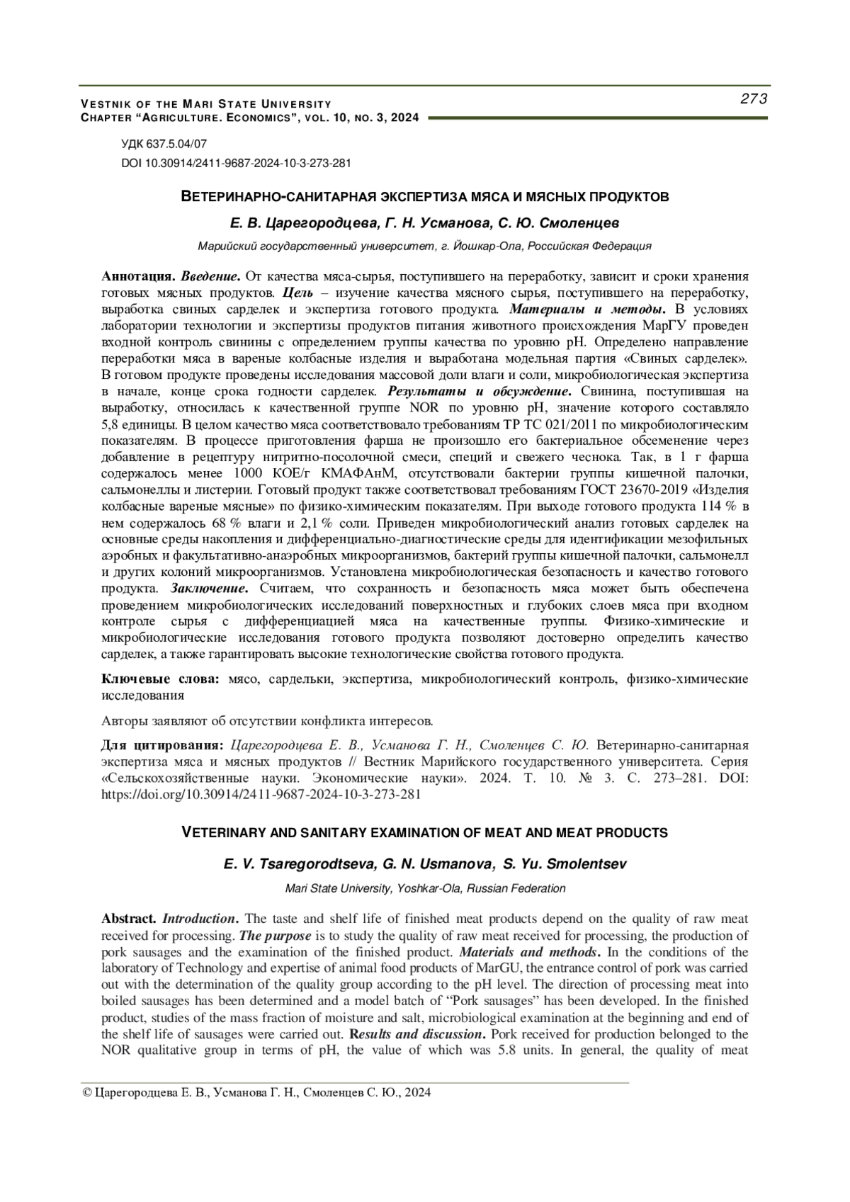 ЦАРЕГОРОДЦЕВА Е. В., УСМАНОВА Г. Н., СМОЛЕНЦЕВ С. Ю. ВЕТЕРИНАРНО-САНИТАРНАЯ ЭКСПЕРТИЗА МЯСА И МЯСНЫХ ПРОДУКТОВ // ВЕСТНИК МАРИЙСКОГО ГОСУДАРСТВЕННОГО УНИВЕРСИТЕТА. СЕРИЯ: СЕЛЬСКОХОЗЯЙСТВЕННЫЕ НАУКИ. ЭКОНОМИЧЕСКИЕ НАУКИ. 2024. Т. 10 № 3 (39)