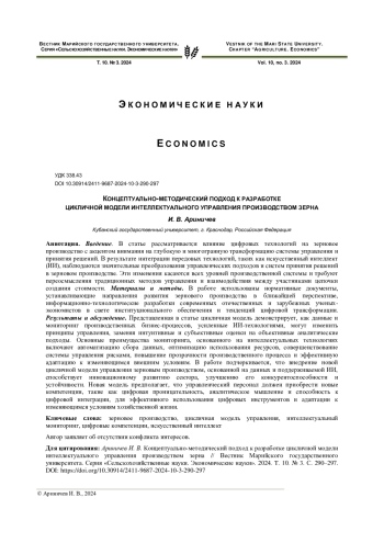 Введение. В статье рассматривается влияние цифровых технологий на зерновое производство с акцентом внимания на глубокую и многогранную трансформацию системы управления и принятия решений. В результате интеграции передовых технологий, таких как искусственный интеллект (ИИ), наблюдаются значительные преобразования управленческих подходов и систем принятия решений в зерновом производстве. Эти изменения касаются всех уровней производственной системы и требуют переосмысления традиционных методов управления и взаимодействия между участниками цепочки создания стоимости. Материалы и методы. В работе использованы нормативные документы, устанавливающие направления развития зернового производства в ближайшей перспективе, информационно-технологические разработки современных отечественных и зарубежных ученых-экономистов в свете институционального обеспечения и тенденций цифровой трансформации. Результаты и обсуждение. Представленная в статье цикличная модель демонстрирует, как данные и мониторинг производственных бизнес-процессов, усиленные ИИ-технологиями, могут изменить принципы управления, заменяя интуитивные и субъективные оценки на объективные аналитические подходы. Основные преимущества мониторинга, основанного на интеллектуальных технологиях включают автоматизацию сбора данных, оптимизацию использования ресурсов, совершенствование системы управления рисками, повышение прозрачности производственного процесса и эффективную адаптацию к изменяющимся внешним условиям. В работе подчеркивается, что внедрение новой цикличной модели управления зерновым производством, основанной на данных и поддерживаемой ИИ, способствует инновационному развитию сектора, улучшению его конкурентоспособности и устойчивости. Новая модель предполагает, что управленческий персонал должен приобрести новые компетенции, такие как цифровая проницательность, аналитическое мышление и способность к цифровой интеграции, для эффективного использования цифровых инструментов и адаптации к изменяющимся условиям хозяйственной жизни.