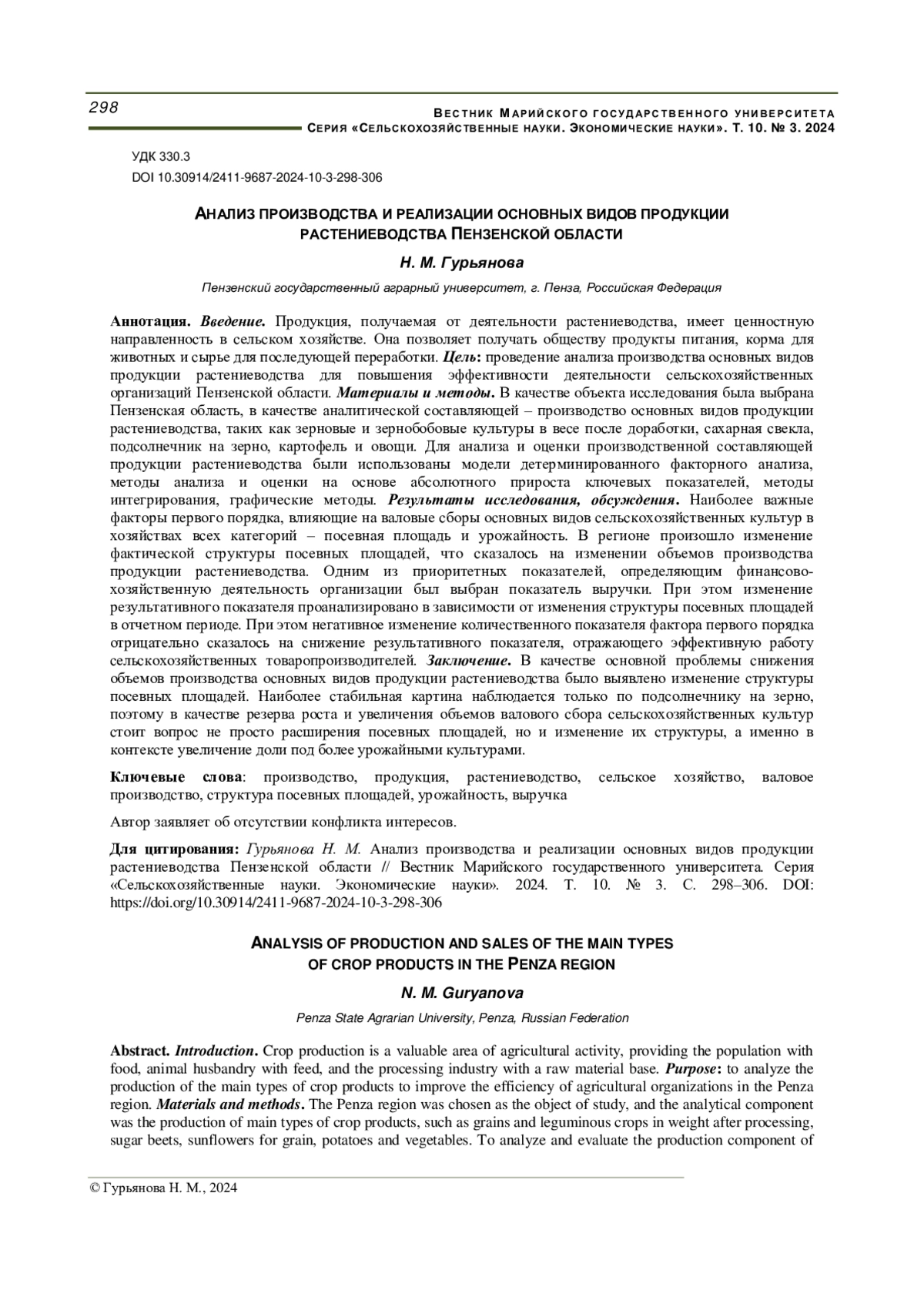 Целью статьи является проведение анализа и оценки производства и реализации основных видов продукции растениеводства для повышения эффективности деятельности сельскохозяйственных организаций на материалах Пензенской области.