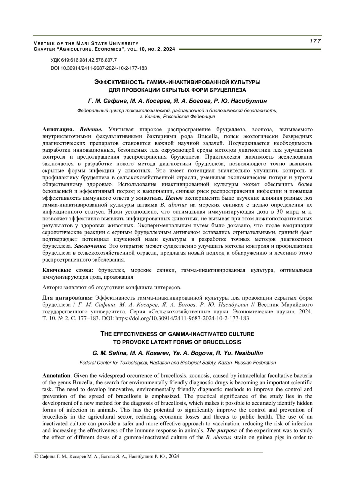 Ведение. Учитывая широкое распространение бруцеллеза, зооноза, вызываемого внутриклеточными факультативными бактериями рода Brucella, поиск экологически безвредных диагностических препаратов становится важной научной задачей. Подчеркивается необходимость разработки инновационных, безопасных для окружающей среды методов диагностики для улучшения контроля и предотвращения распространения бруцеллеза. Практическая значимость исследования заключается в разработке нового метода диагностики бруцеллеза, позволяющего точно выявлять скрытые формы инфекции у животных. Это имеет потенциал значительно улучшить контроль и профилактику бруцеллеза в сельскохозяйственной отрасли, уменьшая экономические потери и угрозы общественному здоровью. Использование инактивированной культуры может обеспечить более безопасный и эффективный подход к вакцинации, снижая риск распространения инфекции и повышая эффективность иммунного ответа у животных. Целью эксперимента было изучение влияния разных доз гамма-инактивированной культуры штамма B. abortus на морских свинках с целью определения их инфекционного статуса. Нами установлено, что оптимальная иммунизирующая доза в 30 млрд м. к. позволяет эффективно выявлять инфицированных животных, не вызывая при этом ложноположительных результатов у здоровых животных. Экспериментальным путем было доказано, что после вакцинации серологические реакции с единым бруцеллезным антигеном оставались отрицательными, данный факт подтверждает потенциал изученной нами культуры в разработке точных методов диагностики бруцеллеза.