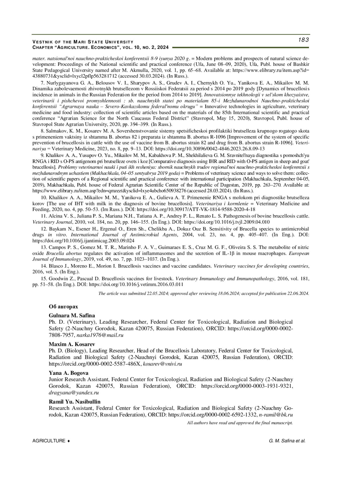 5. Оптимальный способ инактивации культуры штамма B. abortus R-1096 / М. А. Косарев, Г. М. Сафина, Я. А. Богова, Л. А. Тухватуллина, М. М. Сальникова // Инновационные решения актуальных вопросов биобезопасности: сб. матер. Международной научно-практической конференции (г. Казань, 02 декабря 2022 г.). Казань: Альянс 2022. С. 197-200. URL: item.asp?edn=&ysclid=lxycachtmz436260702 (дата обращения: 28.03.2024). EDN: JVZWOD