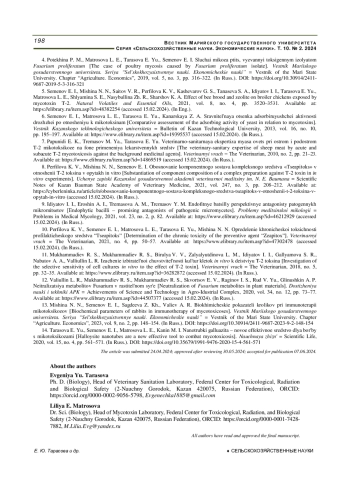 13. Биохимические показатели кроликов при иммунотерапии микотоксикозов / Н. Н. Мишина, Э. И. Семенов, З. Х. Сагдеева, А. Р. Валиев // Вестник Марийского государственного университета. Серия “Сельскохозяйственные науки. Экономические науки”. 2023. Т. 9. № 2 (34). С. 148-154. DOI: 10.30914/2411-9687-2023-9-2-148-154 EDN: BAITNC