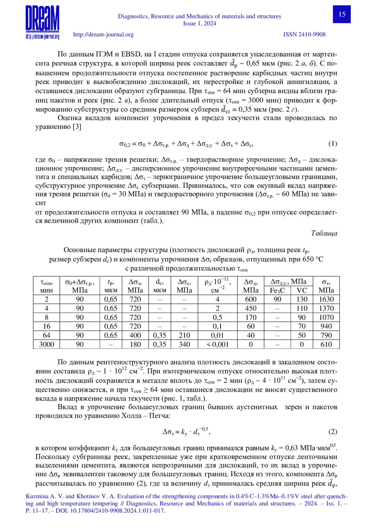 Методами просвечивающей электронной микроскопии, дифракции обратно рассеянных электронов и рентгеноструктурного анализа прослежена эволюция микроструктуры стали 38Г2Ф и проведена количественная оценка компонент упрочнения и их относи-тельного вклада в предел текучести данной стали после закалки и отпуска при 650 °C. Разупрочнение стали при увеличении продолжительности изотермического отпуска отп от 2 до 3000 минут происходит в две стадии: интенсивный темп падения прочностных свойств /отп ~ 100 МПа/мин на I стадии (отп ≤ 8 мин) сменяется слабым разупрочнением /отп ~ 0,1 МПа/мин на II стадии (отп ≥ 64 мин). Показано, что основной вклад (q ~ 80 %) в предел текучести стали 38Г2Ф на I стадии отпуска мартенсита вносит совокупное действие дислокационного и зернограничного (за счет границ реек) механизмов упрочнения, а на II стадии отпуска – субзеренное упрочнение.