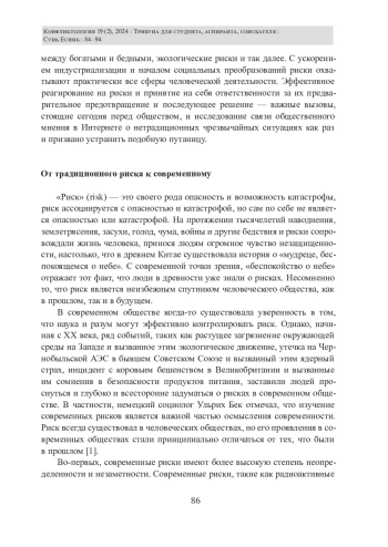 «Общество риска» - это концепция, предложенная ученым Ульрихом Беком в конце ХХ века, которая изменяет наше понимание социальных и экономических процессов в современном мире. Это общество, в котором риск становится неотъемлемой частью нашей жизни, пронизывая все сферы деятельности - от экономики и политики до окружающей среды и здоровья. Основное предположение общества риска заключается в том, что в условиях современного глобализированного мира мы сталкиваемся с новыми, неизвестными и непредсказуемыми видами рисков. Эти риски не могут быть управляемыми и контролируемыми в той же степени, в какой это было возможно в прежние времена. Они могут возникнуть из-за технологических инноваций, экологических изменений, террористических угроз, экономических кризисов и других факторов. В обществе риска ключевую роль играет информация и ее распространение. С развитием интернета и социальных сетей информация о рисках становится доступной широкой публике, что, с одной стороны, может повысить осведомленность людей и помочь им принимать осознанные решения, но, с другой стороны, может вызвать панику и тревогу. С тех пор, с распространением глобальных кризисов, таких как финансовый кризис, коровье бешенство и вирус SARS, эта теория постепенно стала объектом исследования ученых всего мира. По совпадению, почти одновременно с публикацией книги разразилась крупнейшая в истории человечества ядерная авария. Чернобыльская катастрофа в апреле того года повергла мир в состояние неопределенности и уныния. Общество риска постепенно превратилось в огромную область изучения, а теория стала почти просвещением, направив внимание общественности на проблемы, которые до этого держались в тени. В статье рассматриваются основные положения теории и ее изучение в России и Китае.