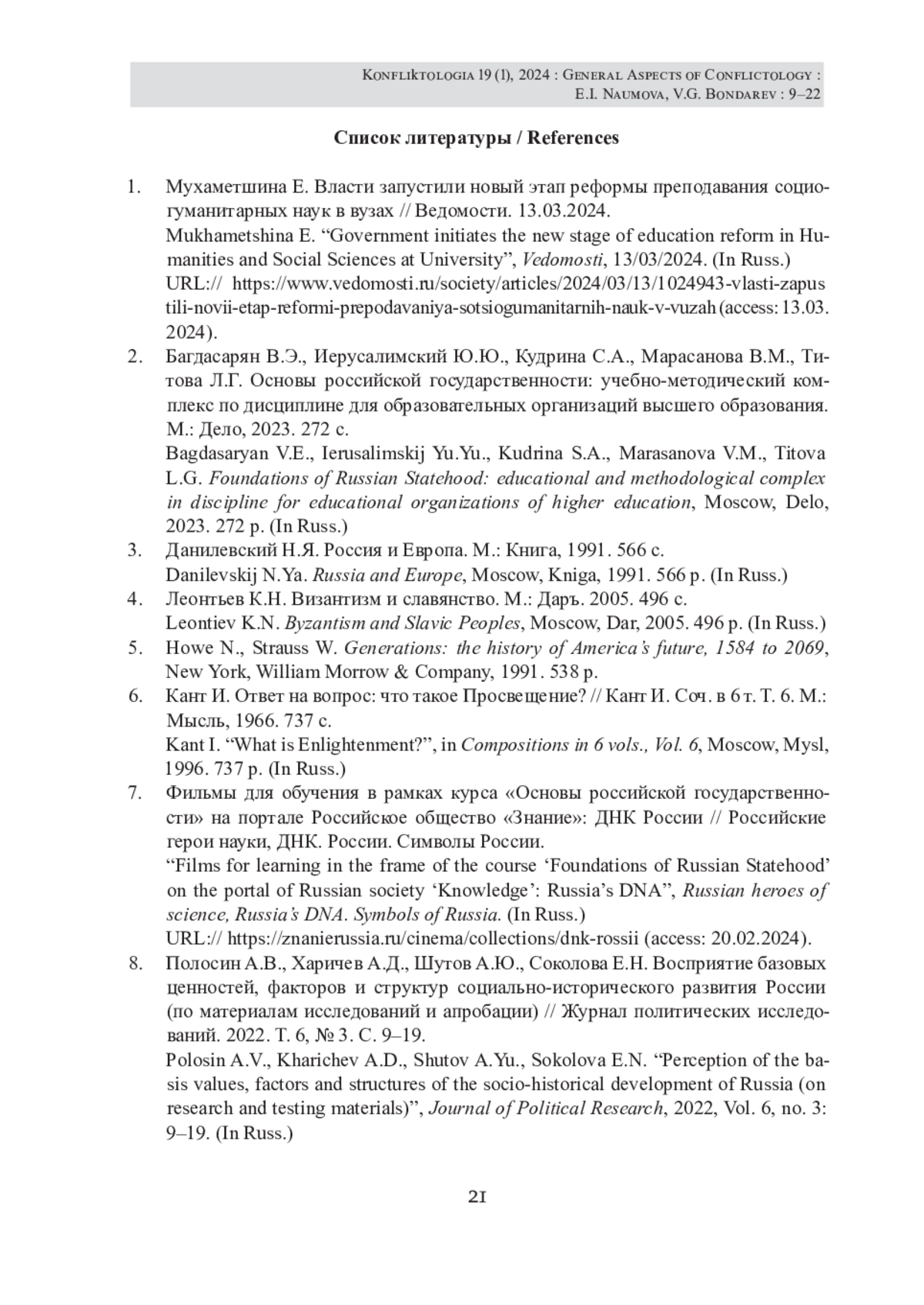 1. Мухаметшина Е. Власти запустили новый этап реформы преподавания социогуманитарных наук в вузах // Ведомости. 13.03.2024. URL:// https://www. vedomosti. ru/society/articles/2024/03/13/1024943-vlasti-zapustili-novii-etap-reformi-prepodavaniya-sotsiogumanitarnih-nauk-v-vuzah (access: 13.03.2024). 2. Багдасарян В. Э., Иерусалимский Ю. Ю., Кудрина С. А., Марасанова В. М., Титова Л. Г. Основы российской государственности: учебно-методический комплекс по дисциплине для образовательных организаций высшего образования. М.: Дело, 2023. 272 с. 3. Данилевский Н. Я. Россия и Европа. М.: Книга, 1991. 566 с. 4. Леонтьев К. Н. Византизм и славянство. М.: Даръ. 2005. 496 с. EDN: QWKHTZ 5. Howe N., Strauss W. Generations: the history of America’s future, 1584 to 2069, New York, William Morrow & Company, 1991. 538 р. 6. Кант И. Ответ на вопрос: что такое Просвещение? // Кант И. Соч. в 6 т. Т. 6. М.: Мысль, 1966. 737 с. 7. Фильмы для обучения в рамках курса “Основы российской государственности” на портале Российское общество “Знание”: ДНК России // Российские герои науки, ДНК. России. Символы России. URL:// https://znanierussia. ru/cinema/collections/dnk-rossii (access: 20.02.2024). 8. Полосин А. В., Харичев А. Д., Шутов А. Ю., Соколова Е. Н. Восприятие базовых ценностей, факторов и структур социально-исторического развития России (по материалам исследований и апробации) // Журнал политических исследований. 2022. Т. 6, № 3. С. 9-19. EDN: EGEABU 9. Полосин А. В. Ценности и ДНК России. Выступление на форуме сообществ молодых специалистов “Форсаж 2023” в рамках проекта Знание. Лекторий. URL:// https://znanierussia. ru/library/video/cennosti-i-dnk-rossii-3428? from=cinema (access: 5.02.2024). 10. Указ Президента РФ от 9 ноября 2022 г. № 809 “Об утверждении Основ государственной политики по сохранению и укреплению традиционных российских духовно-нравственных ценностей”. URL://https://rs. gov. ru/app/uploads/2023/09/0001202211090019. pdf (access: 20.02.2024).
