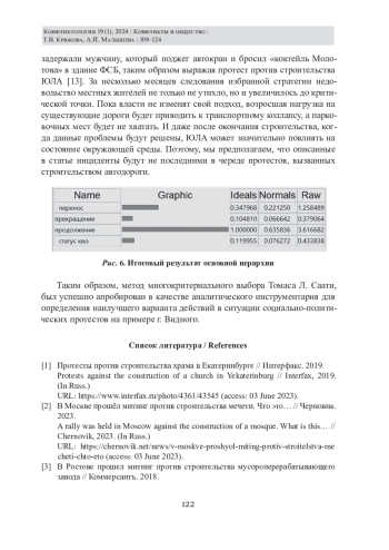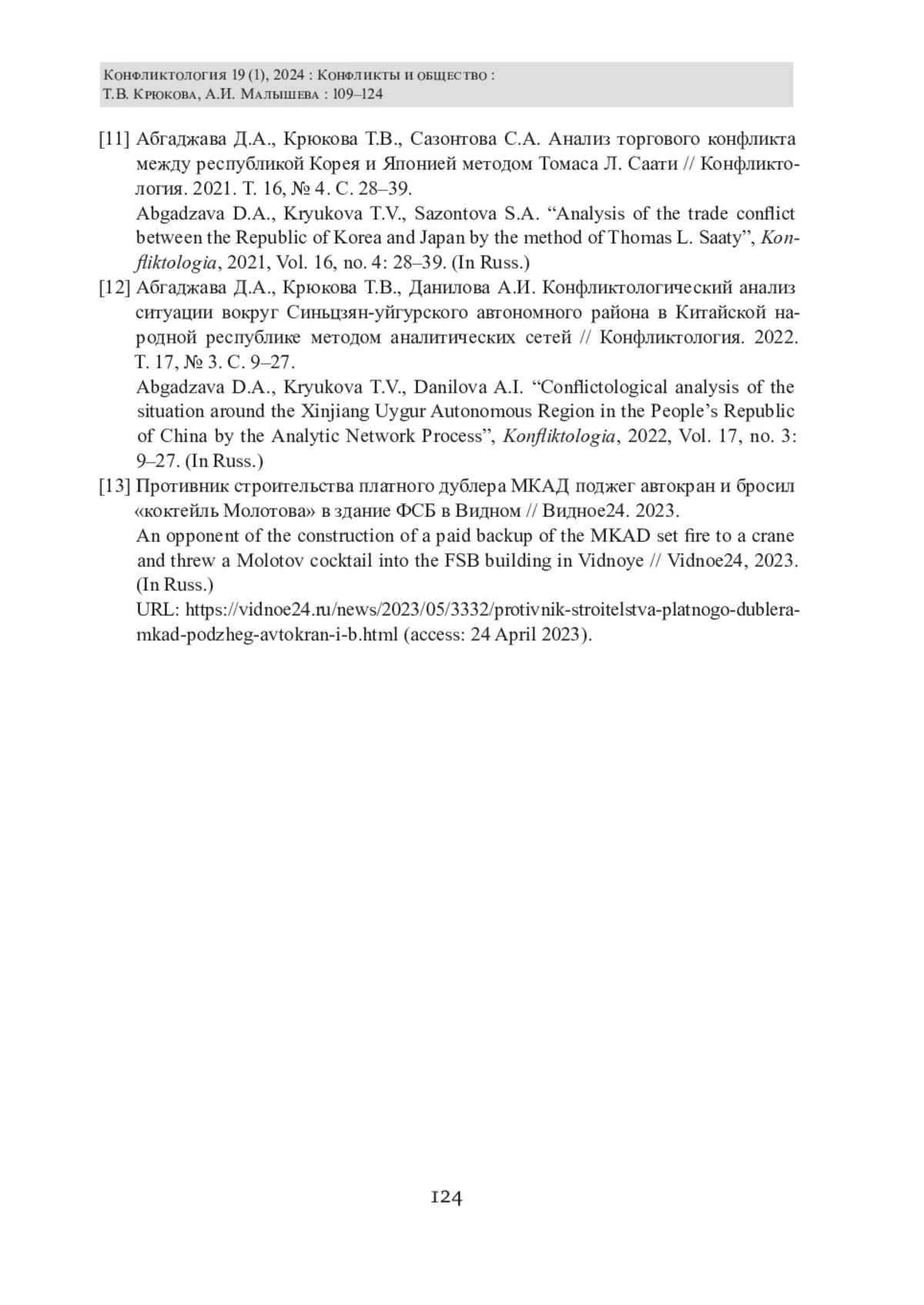 10. Крюкова Т.В., Шумкова К.М. Городские конфликты: анализ ситуации вокруг территории яхт-клуба на Петровской косе методом анализа иерархий // Конфликтология. 2021. Т. 16, № 1. С.76-88. EDN: CUHWOL
