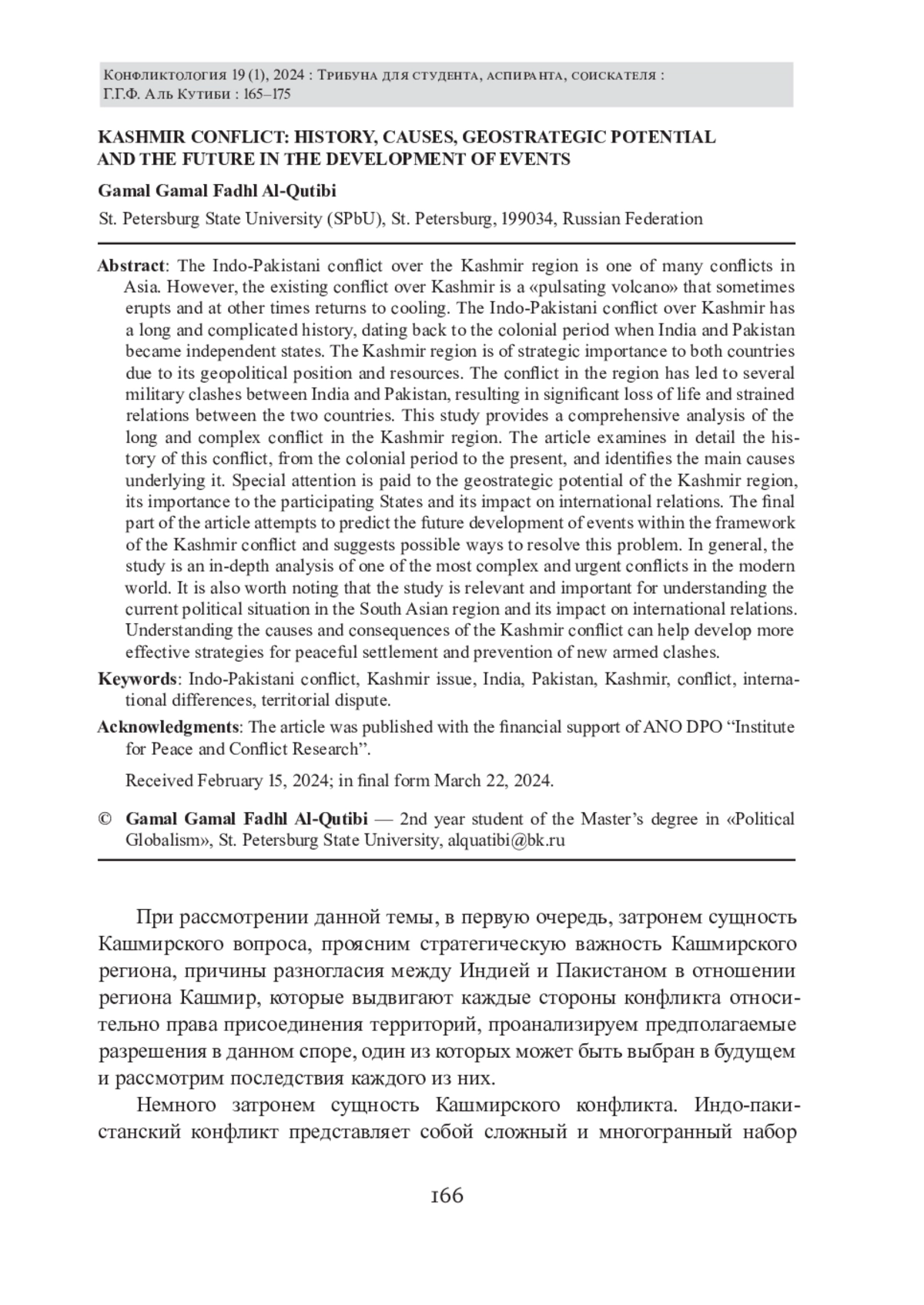 Индо-Пакистанский конфликт из-за региона Кашмира является одним из многих конфликтов в Азии. Однако существующий конфликт вокруг Кашмира является «пульсирующим вулканом», который иногда вспыхивает, а в другое время возвращается к охлаждению. Индо-Пакистанский конфликт вокруг Кашмира имеет долгую и сложную историю, начиная с колониального периода, когда Индия и Пакистан стали независимыми государствами. Регион Кашмир имеет стратегическое значение для обеих стран из-за своего геополитического положения и ресурсов. Конфликт в регионе привел к нескольким военным столкновениям между Индией и Пакистаном, что привело к значительным человеческим потерям и напряженным отношениям между двумя странами. Данное исследование представляет собой комплексный анализ длительного и сложного конфликта в регионе Кашмира. В статье подробно рассматривается история этого конфликта, начиная с колониального периода до современности, а также выявляются основные причины, лежащие в его основе. Особое внимание уделяется геостратегическому потенциалу региона Кашмир, его значимости для государств-участников и влиянию на международные отношения. В заключительной части статьи делается попытка прогнозирования будущего развития событий в рамках Кашмирского конфликта и предлагаются возможные пути разрешения этой проблемы. В целом, исследование представляет собой глубокий анализ одного из наиболее сложных и актуальных конфликтов в современном мире. Также стоит отметить, что исследование является актуальным и важным для понимания современной политической обстановки в регионе Южной Азии и его влияния на международные отношения. Понимание причин и последствий Кашмирского конфликта может помочь разработать более эффективные стратегии мирного урегулирования и предотвращения новых вооруженных столкновений.