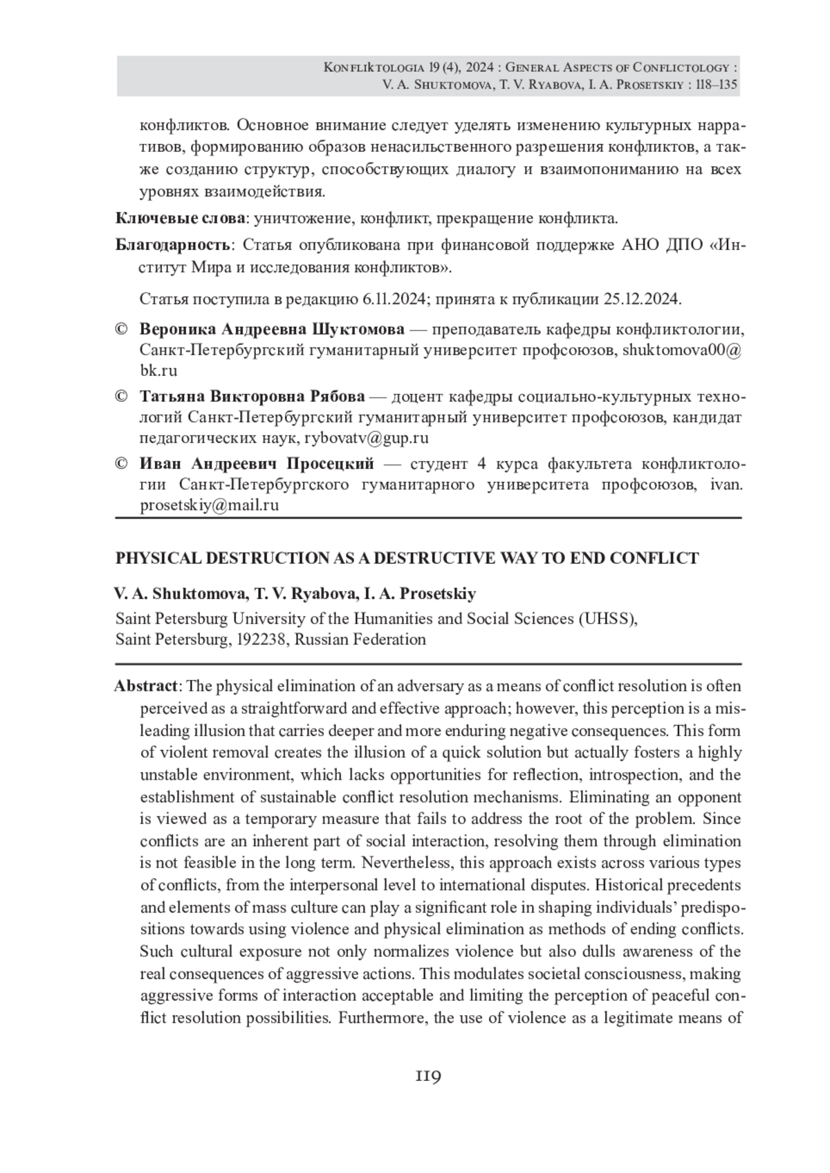 Физическое уничтожение противника как способ разрешения конфликта часто воспринимается как простой и эффективный путь, однако это является обманчивой иллюзией, несущей за собой более глубокие и длительные негативные последствия. Форма насильственного устранения создает иллюзию быстрого решения, но формирует крайне нестабильную среду, в которой отсутствует возможности для осмысления, рефлексии и создания устойчивых механизмов урегулирования конфликтов. Устранение оппонента представляется как временное решение, не способное решить проблему в корне. Поскольку конфликты являются неотъемлемой частью социального взаимодействия, их разрешение посредством уничтожения невозможно в долгосрочной перспективе. Однако данный способ существует в рамках разных типов конфликтов, начиная с межличностного уровня, заканчивая международными конфликтами. Исторические предпосылки и элементы массовой культуры могут играть значительную роль в формировании предрасположенности индивидов к использованию насилия и физического уничтожения как способа прекращения конфликтов. Такая культурная экспозиция не только нормализует насилие, но и притупляет восприятие реальных последствий агрессивных действий. Это модулирует общественное сознание, делая приемлемыми агрессивные формы взаимодействия и ограничивая представление о возможностях мирного разрешения конфликтов. Кроме того, использование насилия как легитимного средства решения проблем ограничивает способность общества к конструктивному диалогу и поиску компромиссов. В среде, где физическое уничтожение воспринимается как возможный метод разрешения конфликта, особую роль приобретает образование и продвижение ненасильственных подходов. Разработка и внедрение образовательных программ и политических инициатив, направленных на развитие навыков медиации, эмпатии и критического мышления, могут помочь в транскультурном понимании позитивных аспектов конфликта и его преобразования в конструктивную силу для изменения и прогресса. Долгосрочные стратегии по предотвращению насилия должны учитывать исторические, культурные и психологические факторы, влияющие на решение конфликтов. Основное внимание следует уделять изменению культурных нарративов, формированию образов ненасильственного разрешения конфликтов, а также созданию структур, способствующих диалогу и взаимопониманию на всех уровнях взаимодействия.