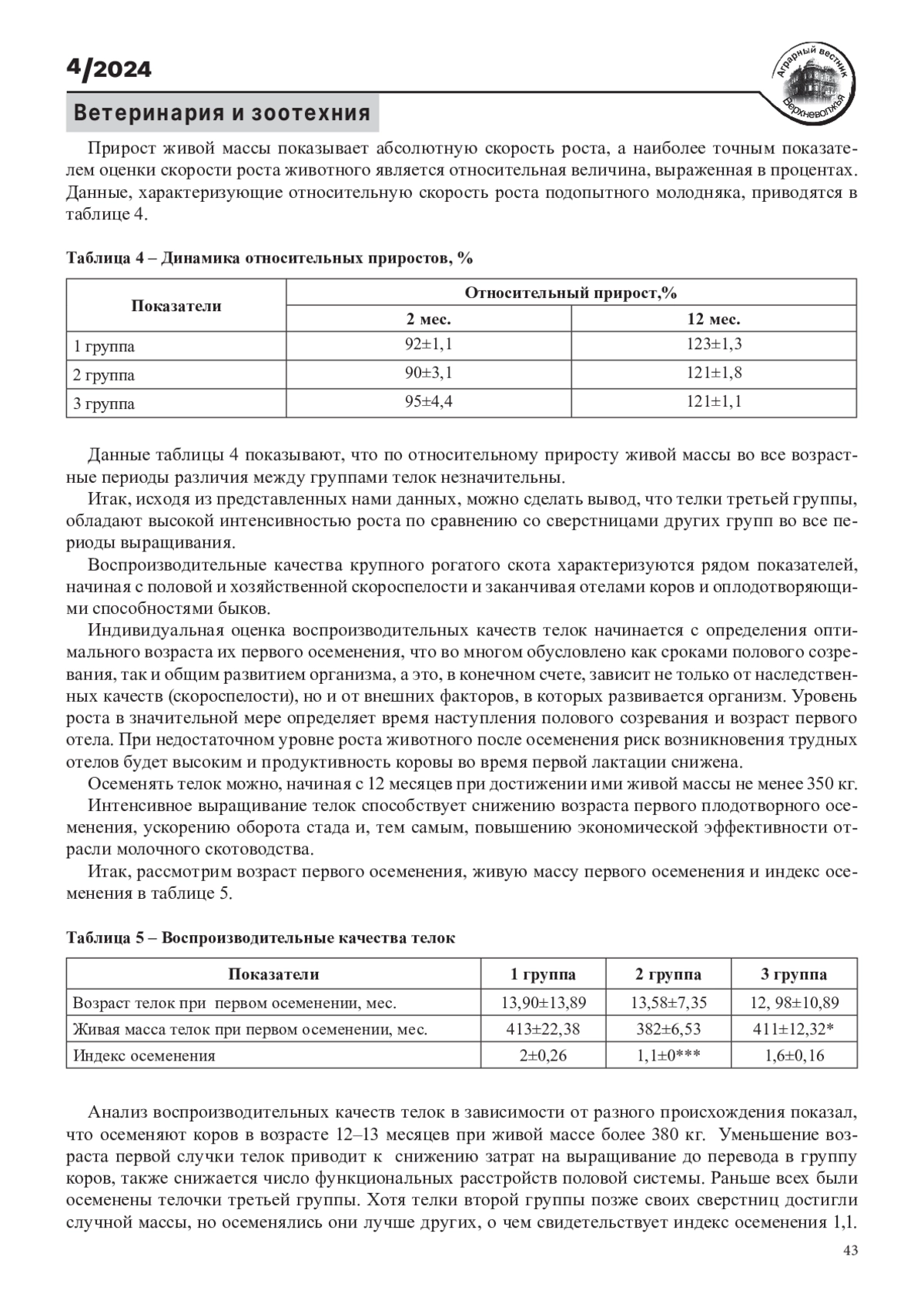 6. Третьяков Е.А., Кичина А.П. Динамика живой массы и приростов ремонтных телок Вологодского типа черно-пестрой породы разных линий // Молочнохозяйственный Вестник. 2021. № 3. С. 85-98. EDN: DAZAVN