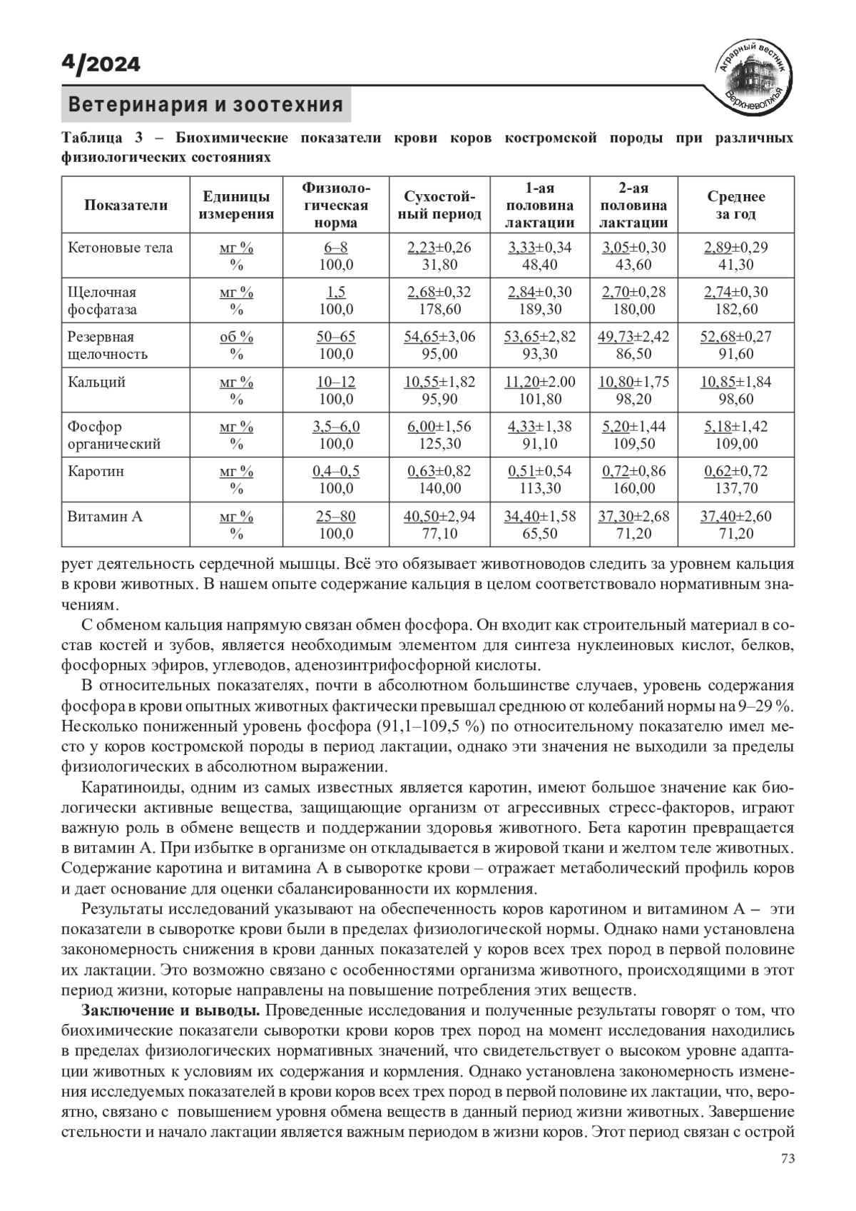 Результаты исследований продемонстрированы в виде таблиц. В числителе табличного материала указаны абсолютные результаты исследуемых компонентов сыворотки крови коров в общепринятых единицах измерения на фоне допустимых физиологических норм в пределах их колебаний. Показатели знаменателя выражают в процентах сложившееся относительное (фактическое) состояние, при этом за 100 % принято среднее от двух предельных границ колебаний нормы. Статистическая значимость полученных результатов соответствовала обычному уровню.