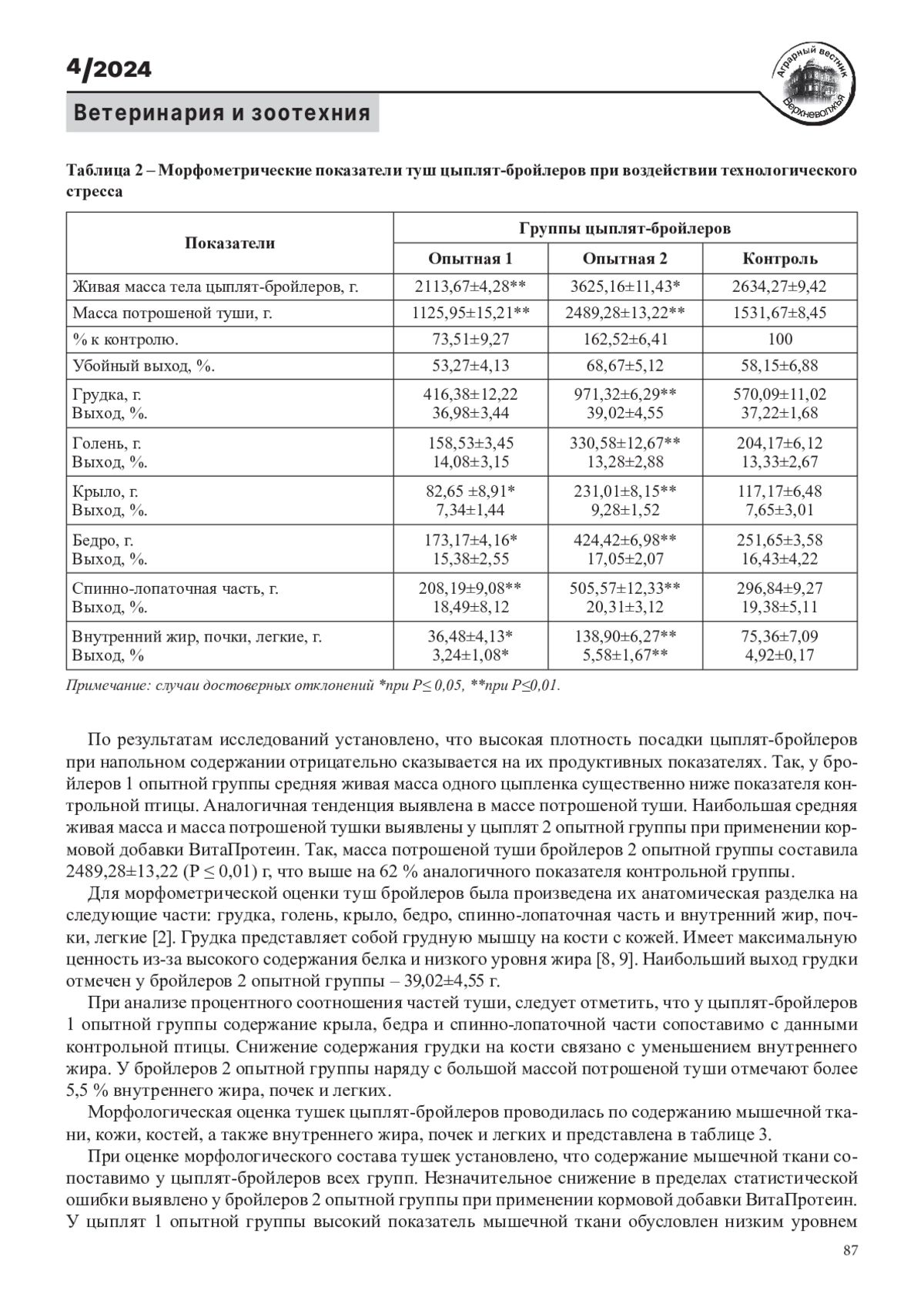 В настоящих исследованиях изучены морфометрические и морфологические показатели тушек цыплят-бройлеров при воздействии технологического стресса на фоне переуплотненного напольного содержания. До 10-суточного возраста плотность посадки для цыплят бройлеров всех групп была одинаковой - 30 голов на 1 м2 площади пола. В дальнейшем, начиная с 11-суточного возраста, плотность посадки на 1 м2 площади при содержании цыплят-бройлеров опытных групп увеличивали на 30 %. Выявлено, что переуплотненное напольное содержание приводит к снижению продуктивных показателей цыплят. Так, у бройлеров 1 опытной группы средняя живая масса одного цыпленка существенно ниже показателя контрольной птицы. Аналогичная тенденция выявлена в массе потрошеной туши. Наибольшая средняя живая масса и масса потрошеной тушки выявлены у цыплят 2 опытной группы при применении кормовой добавки ВитаПротеин. Так, масса потрошеной туши бройлеров 2 опытной группы составила 2489,28±13,22 (P<0,01) г, что выше на 62 % аналогичного показателя контрольной группы. При оценке морфологического состава тушек установлено, что содержание мышечной ткани сопоставимо у цыплят-бройлеров всех групп. Незначительное снижение в пределах статистической ошибки выявлено у бройлеров 2 опытной группы при применении кормовой добавки ВитаПротеин. У цыплят 1 опытной группы высокий показатель мышечной ткани обусловлен низким уровнем внутреннего жира, почек и легких. Содержание имеет относительно постоянные значения у всех бройлеров. Введение в рационы цыплят кормовой добавки ВитаПротеин способствует активизации защитно-приспособительной реакции и получению высоких показателей мясной продуктивности и качества мяса.
