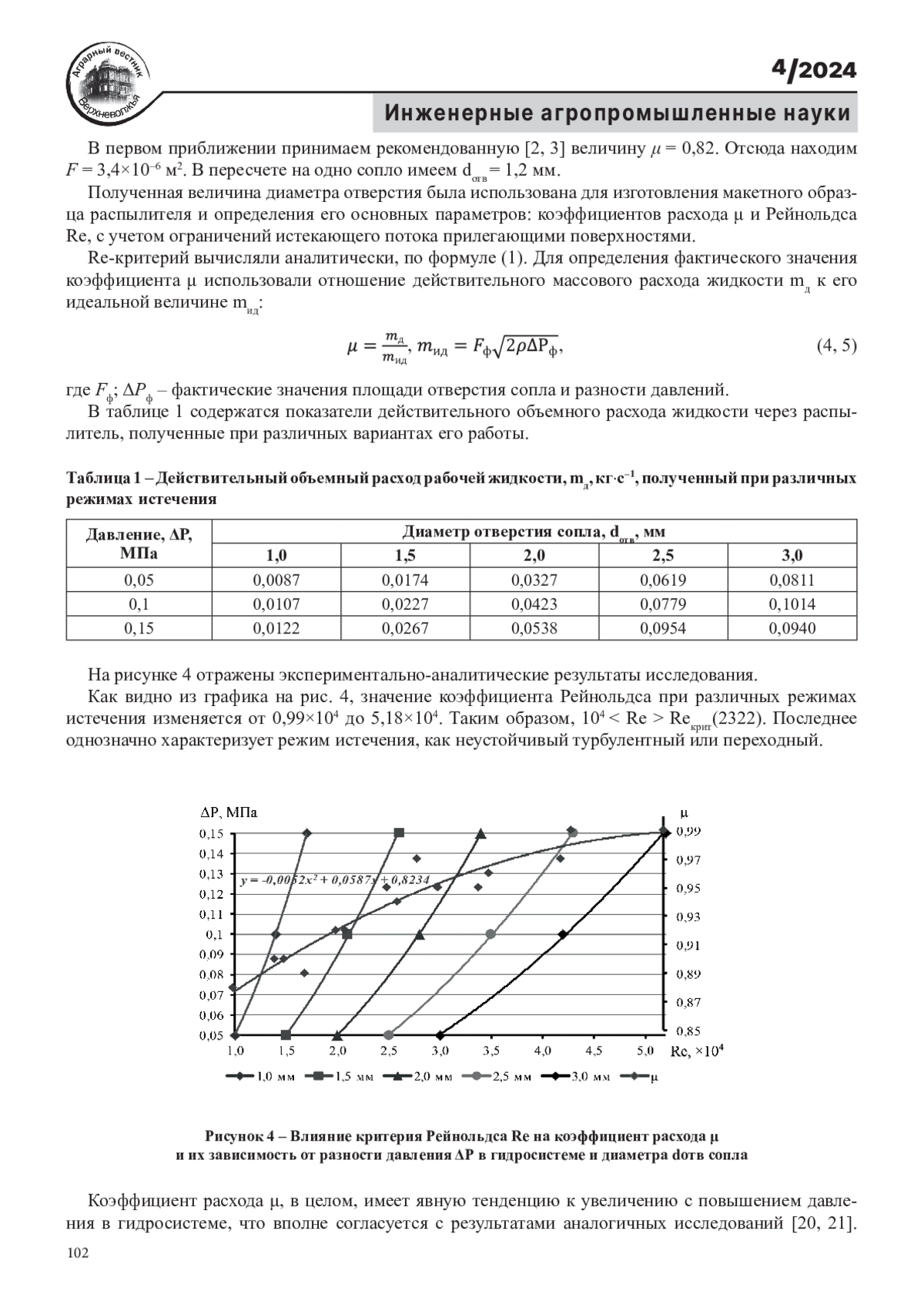 Использовались следующие методы научного исследования: литературный обзор; анализ теоретических основ процессов истечения струй; методы описания, сопоставления, обобщения и классификации; выявление новых связей между объектами, стендовый эксперимент, графическая интерпретация анализа рабочего процесса. В качестве объекта классификационной экспертизы, гидравлических испытаний и оптимизации принят разработанный авторами мультирежимный распылитель [14]. Экспериментальная часть исследования заключалась в оценке параметров расхода распылителя, в зависимости от диаметра отверстия сопла и давления в гидросистеме, с учетом имеющегося ограничения струи. Простейшая лабораторная установка состоит из кронштейна с закрепленным распылителем, емкости, вибрационного насоса ВН-15В, регулятора давления и ванны. Принятые диаметры выходных отверстий распылителя – 1,0; 1,5; 2,0; 2,5; 3,0 мм. Давление в гидросистеме – 0,05; 0,1; 0,15 МПа. Истекающая струя – полуограничена в верхнем секторе. Повторность опытов – трехкратная.