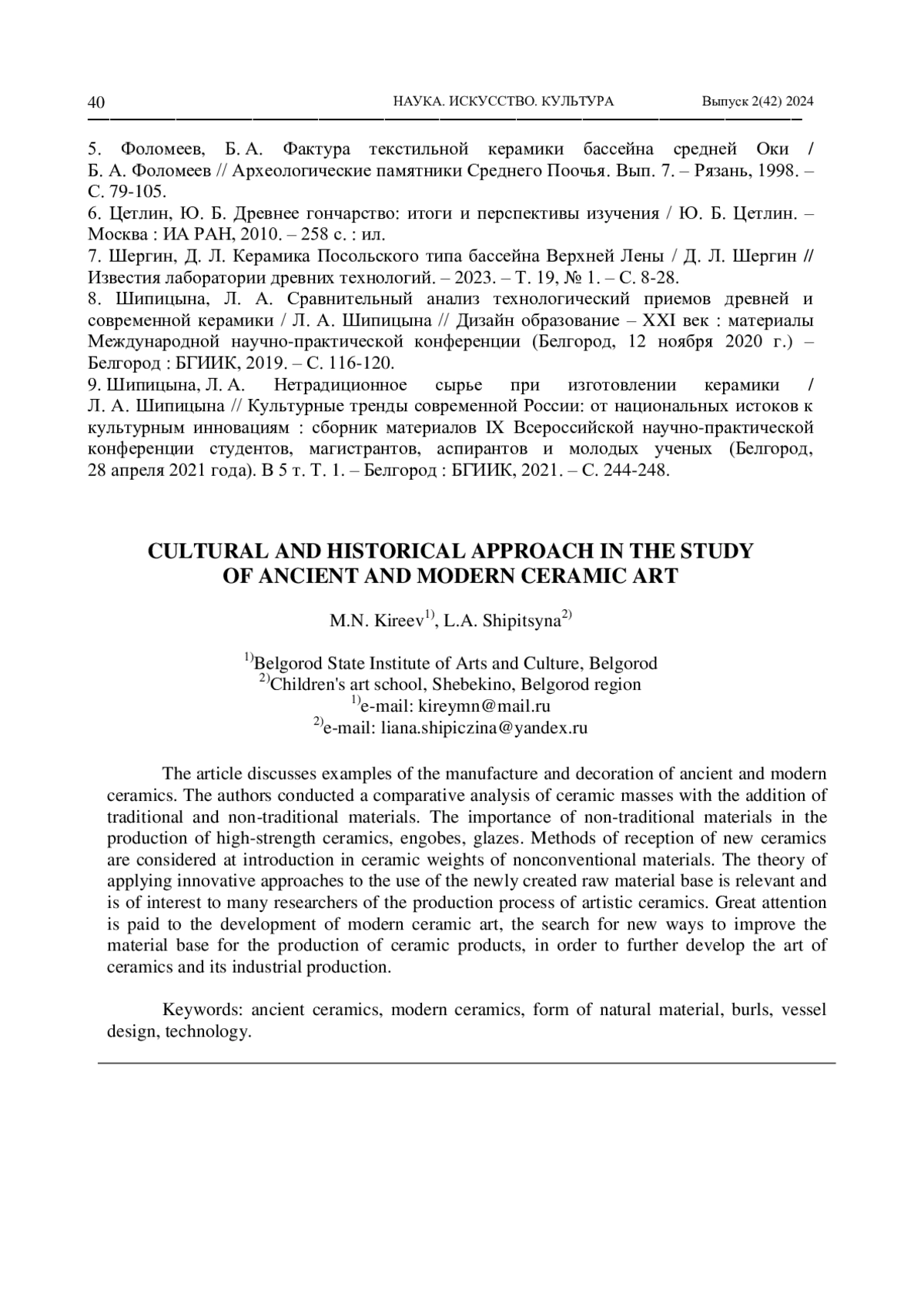 9. Шипицына, Л. А. Нетрадиционное сырье при изготовлении керамики / Л. А. Шипицына // Культурные тренды современной России: от национальных истоков к культурным инновациям: сборник материалов IX Всероссийской научно-практической конференции студентов, магистрантов, аспирантов и молодых ученых (Белгород, 28 апреля 2021 года). В 5 т. Т. 1. - Белгород: БГИИК, 2021. - С. 244-248. EDN: KGBZLV