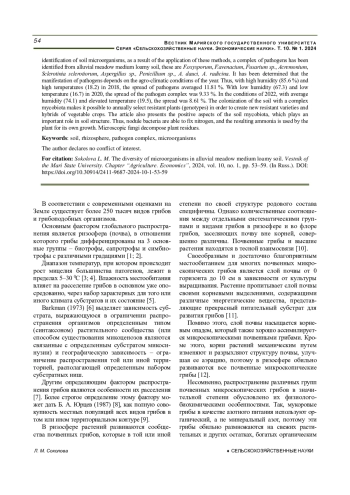 В соответствии с современными оценками на Земле существует более 250 тысяч видов грибов и грибоподобных организмов. Своеобразным и достаточно благоприятным местообитанием для многих почвенных микроскопических грибов является слой почвы от 0 горизонта до 10 см в зависимости от культуры выращивания. На расселение грибов в почве оказывают большое влияние такие факторы, как физические свойства и химический состав почвы, в особенности степень насыщенности почвы органическими веществами, активная кислотность почвы (рН), температура, влажность, обеспеченность кислородом воздуха и, наконец, произрастающие высшие растения в виде целостного фитоценоза, т. е. растительного покрова. Цель работы: Идентифицировать родовую принадлежность микроорганизмов из аллювиально луговой среднесуглинистой почвы и определить распространенность патогенов в зависимости от агроклиматических показателей годов. В статье дается описание методов идентификации почвенных микроорганизмов, в результате применения данных методов выявлено из аллювиально луговой среднесуглинистой почвы комплекс патогенов, это F. oxysporum, F. avenacium, Fusarium sp, Acremonium, Sclerotinia sclerotiorum, Aspergillus sp., Penicillium sp, A. dauci, A. radicina. Определено, что проявление патогенов зависит от агроклиматических условий года. Так при повышенной влажности (85,6 %) и высоких температурах (18,2) 2018 года распространение патогенов в среднем составило 11,81 %. При пониженной влажности (67,3) и низких температурных (16,7) 2020 года распространение комплекса патогенов было 9,33 %. В условиях 2022 года при средних показателях влажности (74,1) и повышенной температуре (19,5) распространение составило 8,61 %. Заселение почвы комплексной микобиотой позволяет ежегодно проводить отборы устойчивых растений (генотипов) с целью создания новых устойчивых сортов и гибридов овощных культур. В статье также приводятся положительные стороны почвенной микобиоты, которая играет важную роль в структуре почвы. Так, клубеньковые бактерии способны фиксировать азот, а образующийся при этом аммиак используется растением для собственного роста. Микроскопические грибы осуществляют разложение растительных остатков.