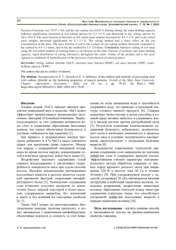 Введение. Хлорид натрия оказывает влияние на функционально-технологические свойства сырья, обеспечивая текстуру, характерный вкус и продлевает срок хранения готовых мясных продуктов. Выбор способа посола в производстве мясных продуктов определяется составом сырья. Интенсификация процесса посола способствует более быстрому и равномерному распределению соли, а также позволяет увеличить влагосвязывающую способность мясного сырья и, как следствие, выход готового продукта. Цель - изучить влияние способа и интенсивности посола на физико-химические свойства говядины. Материалы и методы. В условиях лаборатории Технологии и экспертизы продуктов питания животного происхождения МарГУ проведены исследования изменения массовой доли влаги и соли, водосвязывающей способности при использовании разных способов (мокрый, сухой) и интенсивности посола (покой, массирование). Результаты исследования, обсуждения. В контрольном образце водосвязывающая способность мяса составила 51,2 ± 1,8 %, массовая доля влаги находилась на уровне 75,97 ± 6,6, а соли 0,035 %. За время посола показатель водосвязывающей способности достоверно повысился в вариантах мокрого посола на 5,5-2,6 % и снизился в вариантах сухого посола на 24,6-39,8 %. Массовая доля влаги в образцах мяса мокросоленого способа консервирования увеличилась на 4,8-3,2 %, а сухосоленого достоверно снизилась на 2,1-3,1 %. Способ посола оказал прямое влияние на концентрацию соли в мясе. Массовая доля соли в вариантах мокрого способа посола увеличилась по сравнению с контролем в 4,6-3,3 раза, сухого способа в 3,5-2,8 раза. Заключение. Интенсивный посол мясного сырья мокросоленым способом консервирования приводит к увеличению массовой доли влаги и водосвязывающей способности, быстрому распределению посолочных веществ по всему объему продукта и является наиболее оптимальным в условиях интенсификации процессов производства соленых продуктов.
