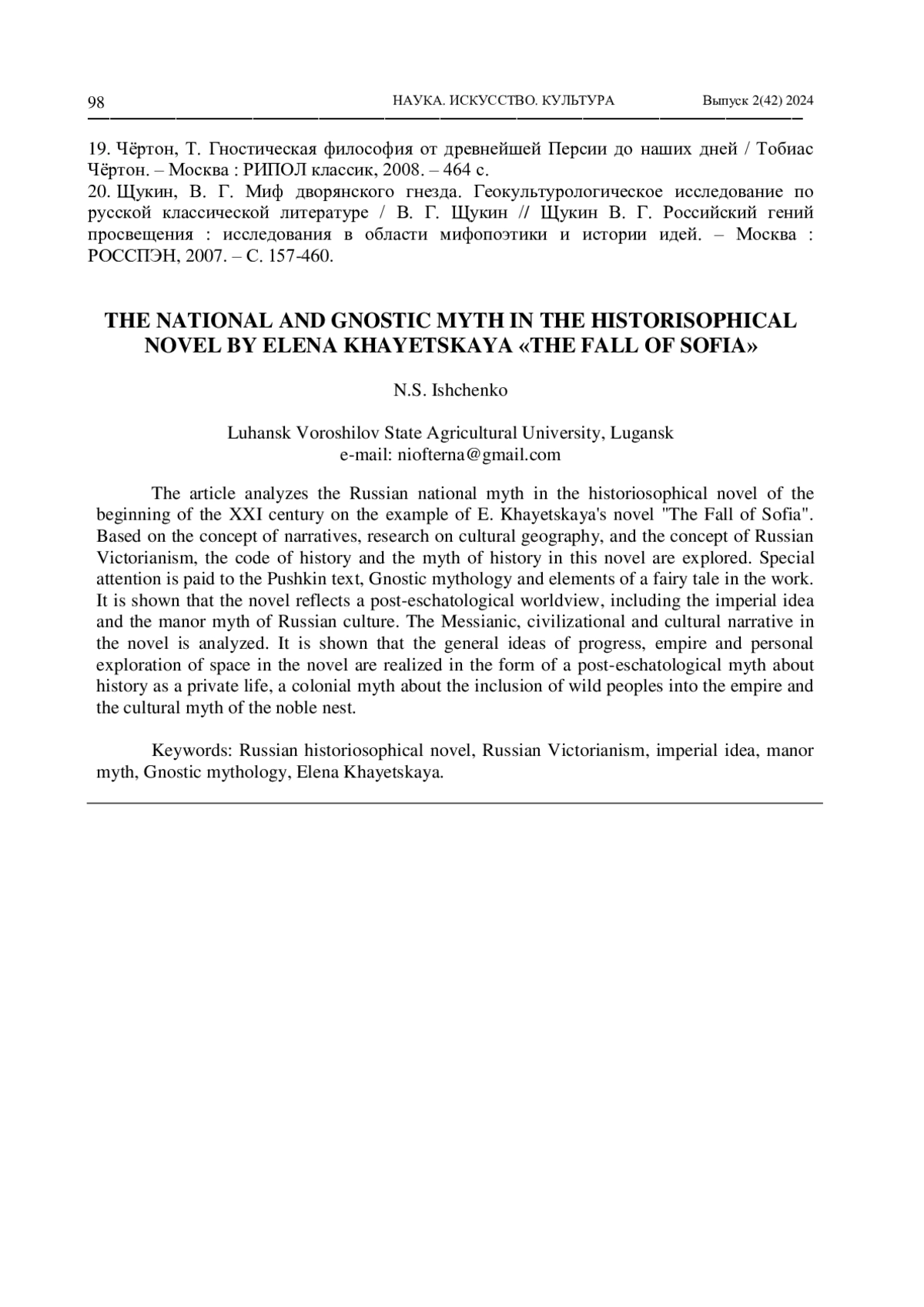 В статье анализируется русский национальный миф в историсофском романе начала XXI века на примере романа Е. Хаецкой «Падение Софии».