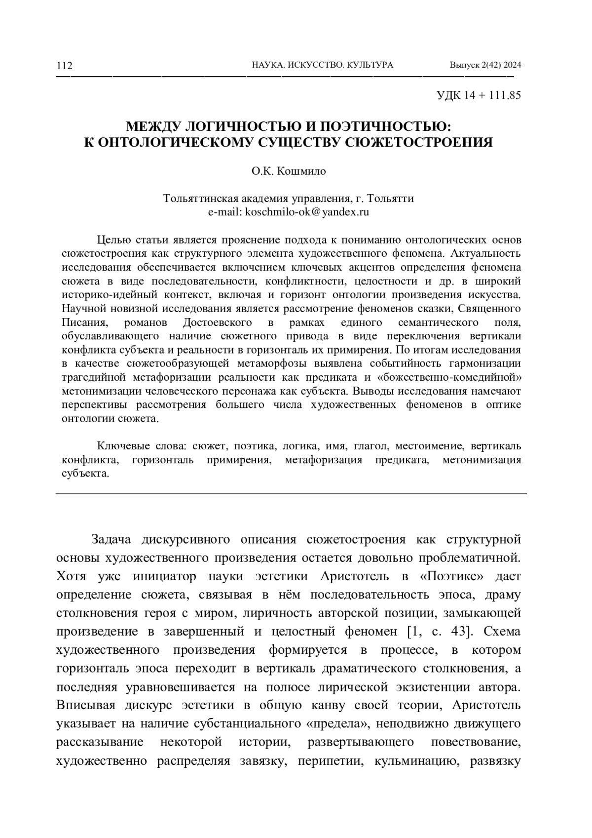 Целью статьи является прояснение подхода к пониманию онтологических основ сюжетостроения как структурного элемента художественного феномена.