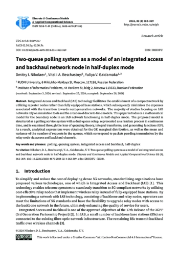 Статья: Two-queue polling system as a model of an integrated access and backhaul network node in half-duplex mode (2024)