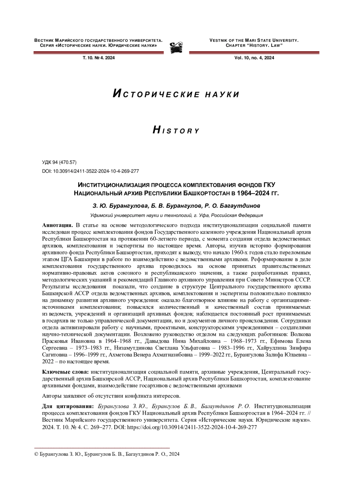 12. Бурангулов Б. В. История государственной архивной службы Башкортостана (1919-1990 гг.). Уфа: РИЦ БашГУ, 2009. 326 с. URL: item.asp?edn= (дата обращения: 30.08.2024). EDN: XXUETZ
