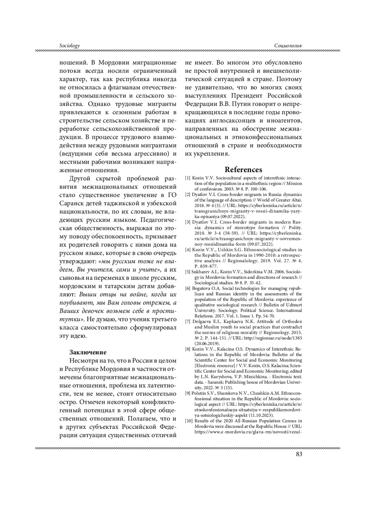 8. Козин В.В., Калачина О.С. Динамика межнациональных отношений в Республике Мордовия: бюллетень Научного центра социально-экономического мониторинга [Электронный ресурс] / В.В. Козин, О.С. Калачина; Науч. центр соц.-экон. мониторинга; под ред. Л.Н. Курышовой, В.П. Миничкиной. - Электрон. текст. дан. - Саранск: Изд-во Мордов. ун-та, 2022. № 3 (15).