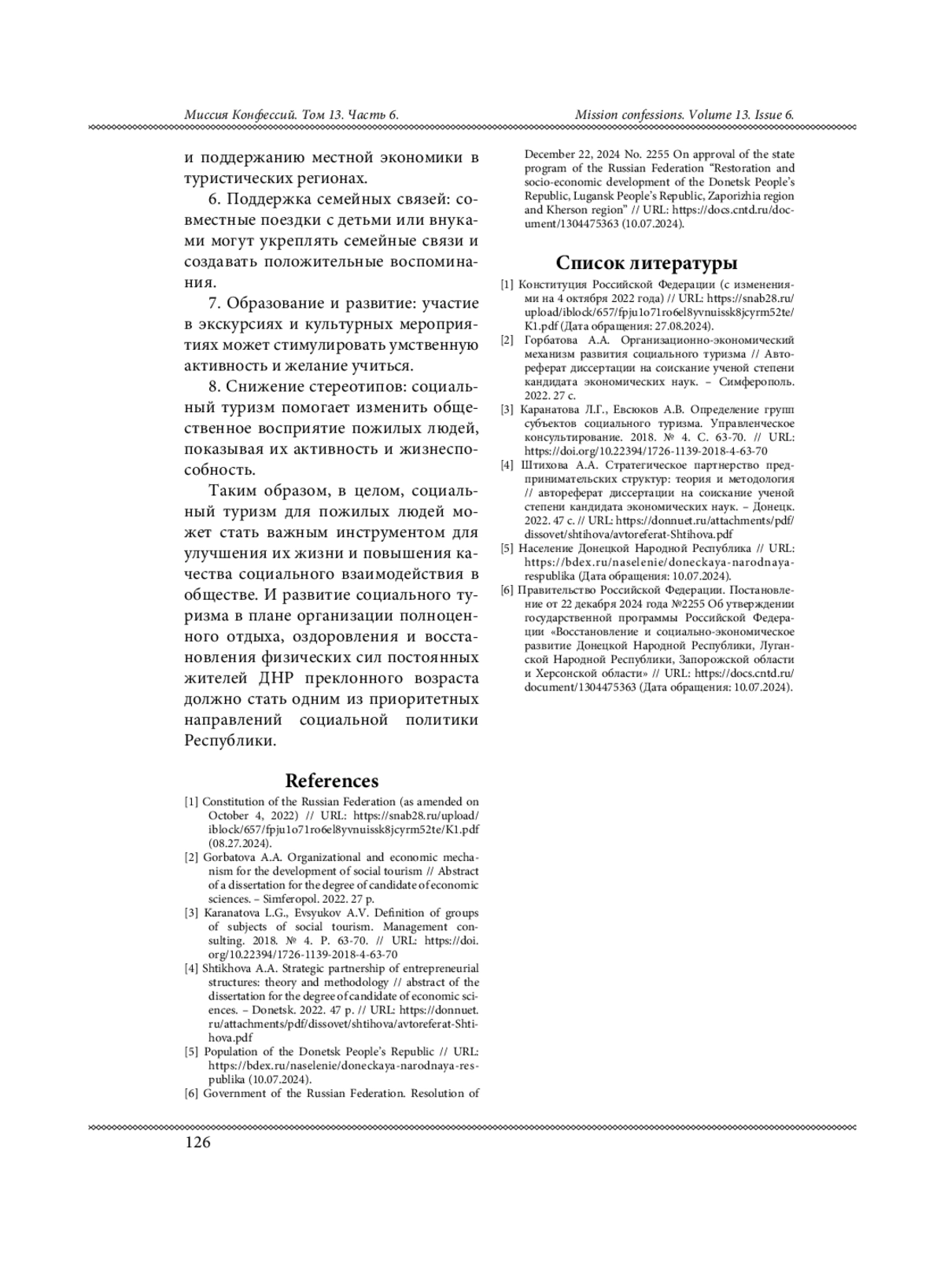 2. Горбатова А.А. Организационно-экономический механизм развития социального туризма // Автореферат диссертации на соискание ученой степени кандидата экономических наук. - Симферополь. 2022. 27 с. EDN: LUCAMM
