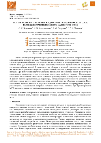 1. Kolesnichenko I., Khalilov R., Khripchenko S. Vortical flow of conducting fluid driven by an alternating magnetic field in a plane channel // Magnetohydrodynamics. – 2007. – Vol. 43, No. 1. – P. 45–52. – DOI: 10.22364/mhd.43.1.5. 2. The impact of flow induced by rotating magnetic fields on processes in a molten conductive medium / R. I. Khalilov, A. D. Mamykin, R. S. Okatev, I. V. Kolesnichenko // Diagnostics, Resource and Mechanics of materials and structures. – 2023. – Iss. 3. – P. 6–16. – DOI: 10.17804/2410-9908.2023.3.006-016. – URL: http://dream-journal.org/issues/2023-3/2023-3_396.html