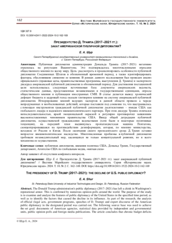 Цель: рассмотреть и проанализировать особенности публичной дипломатии Соединенных Штатов в обозначенный временной период, а также идентифицировать факторы, обусловившие снижение ее влияния. В рамках данного исследования был проведен анализ официального (правовые акты, правительственные программы, выступления Д. Трампа) и экспертного дискурса американской публичной дипломатии в обозначенный период. Для достижения поставленной цели использовалась следующая источниковая база: документы американских ведомств, статистические данные, представленные независимыми и государственными единицами, опросы общественного мнения и публикации иностранных СМИ. В статье делается вывод: хронический дефицит бюджета и кадровый голод оказали тлетворное влияние на систему американской публичной дипломатии. Игнорирование мнений ведущих экспертов в данной области привело к череде непродуманных и необоснованных действий, которые поставили под сомнение то, что выстраивалось с помощью инструментов гражданской публичной дипломатии десятилетиями - имидж США как глобального лидера и надежного внешнеполитического партнера. При этом дискурс Трампа отличался непоследовательностью, яркой эмоциональной окраской и регулярно противоречил заявлениям высокопоставленных чиновников правительства США. Ввиду общей деградации публичной дипломатии, осуществляемой гражданскими ведомствами (хотя были и некоторые позитивные тенденции), на передний план выдвинулась пропагандистская машина Пентагона, сконцентрировавшаяся на противодействии дезинформации, которая, по мнению министерства, исходила от России и Китая. После окончания своего президентского срока Д. Трамп оставил непростое внешнеполитическое наследство. Многочисленные проблемы в публичной дипломатии требовали незамедлительный мер, касающихся не только концептуальной ревизии, но и всего механизма ее осуществления.
