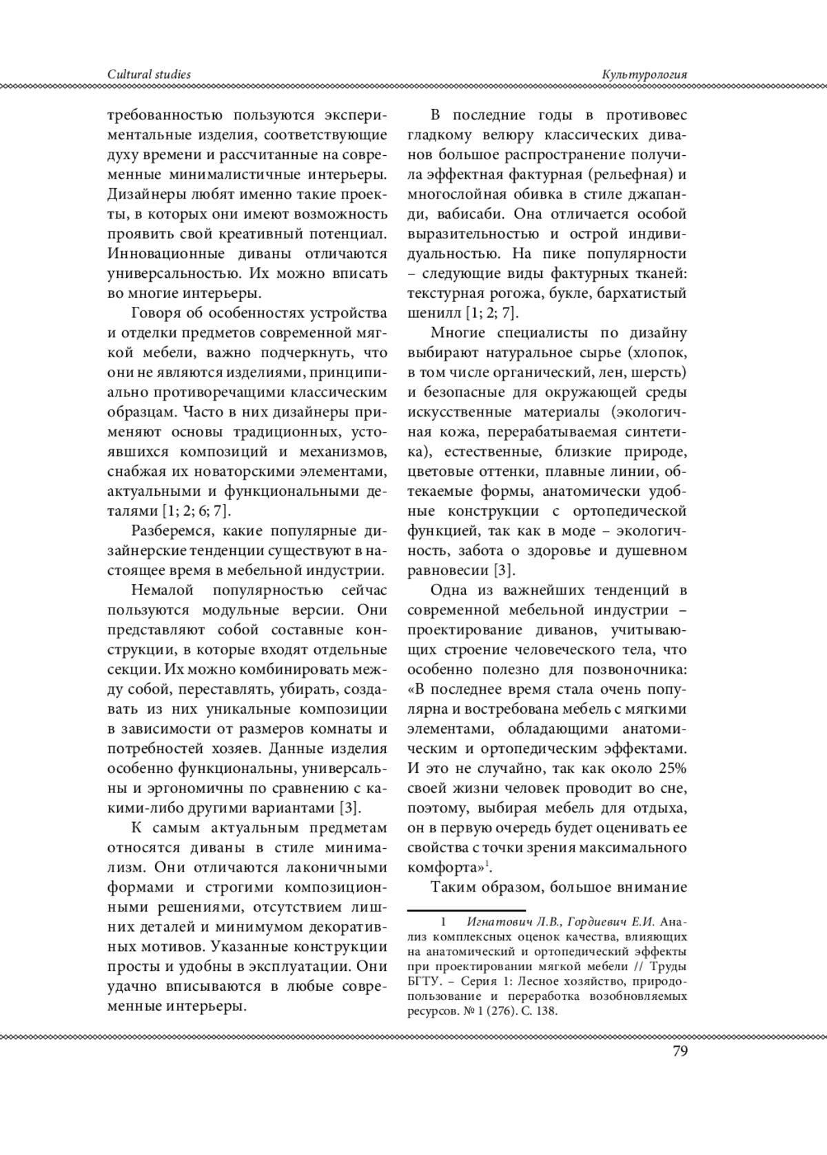 3. Игнатович Л.В., Гордиевич Е.И. Анализ комплексных оценок качества, влияющих на анатомический и ортопедический эффекты при проектировании мягкой мебели // Труды БГТУ. - Серия 1: Лесное хозяйство, природопользование и переработка возобновляемых ресурсов. 2024. № 1 (276). С. 137-147.